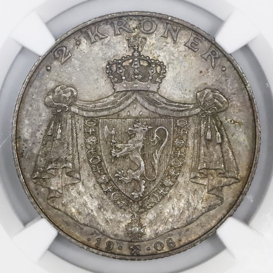 Norway, 2 kroner, 1906, Haakon VII, Norway independence, NGC MS 63. KM-363. Popular circulating commemorative celebrating Norway independence in 1905. Deeply rainbow toned over subdued luster. NGC #4740383-007.