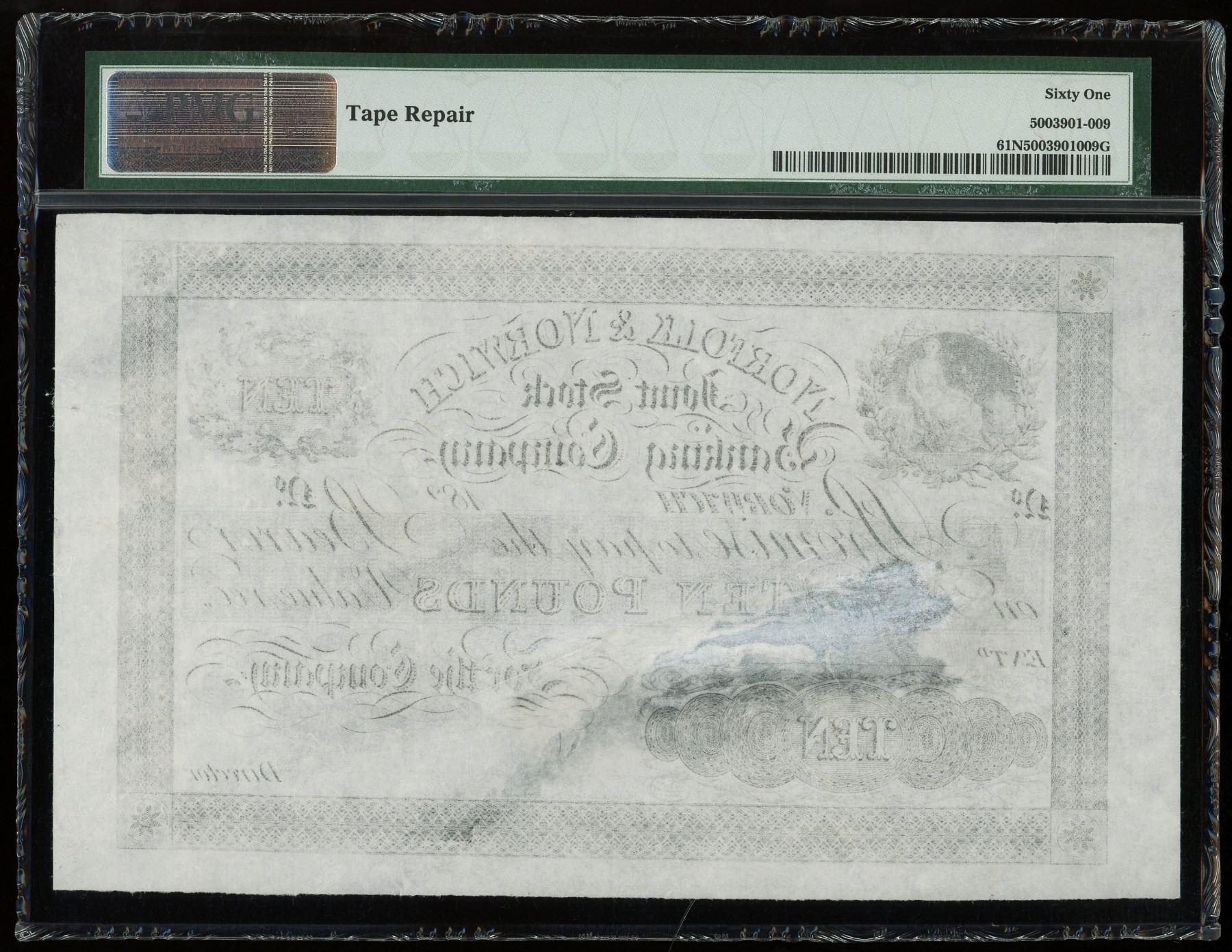Norwich, Great Britain, Norfolk & Norwich Joint Stock Banking Company, 10 pounds front proof, no date (1826-36), PMG UNC 61 net. SCWPM-unlisted; OUT1610b. Sharp designed uniface proof note on delicate paper, patch of thinning at lower left repaired with tape. Please use this link to verify the certification number
