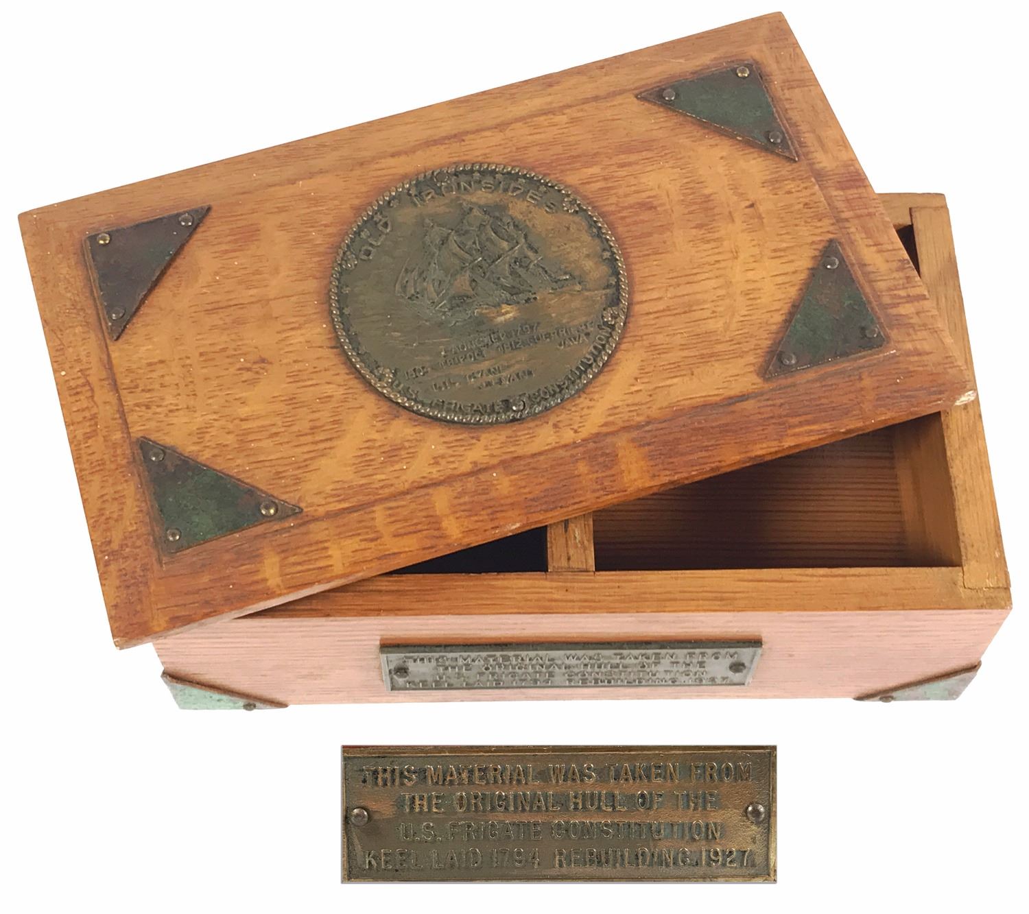 Oak wood box (with plaque) made from pieces of the USS Constitution. 566 grams, 7" x 4" x 2". Fine quality oak wood box made from wood and copper from the U.S. frigate Constitution with round brass plaque on top of high-relief design of the vessel under full sail and inscription, "Old Ironsides, Launched 1797, 1804 Tripoli, 1812 Guerriere Java, 1815 Cyane Levant, U.S. frigate Constitution" and rectangular brass plaque on side with the inscription, "This material was taken from the original hull of the U.S. frigate Constitution keel laid 1794 rebuilding 1927"; triangular copper adornments well patinated, two compartments inside. A lovely coffee-table piece and a must for US navy aficionados.