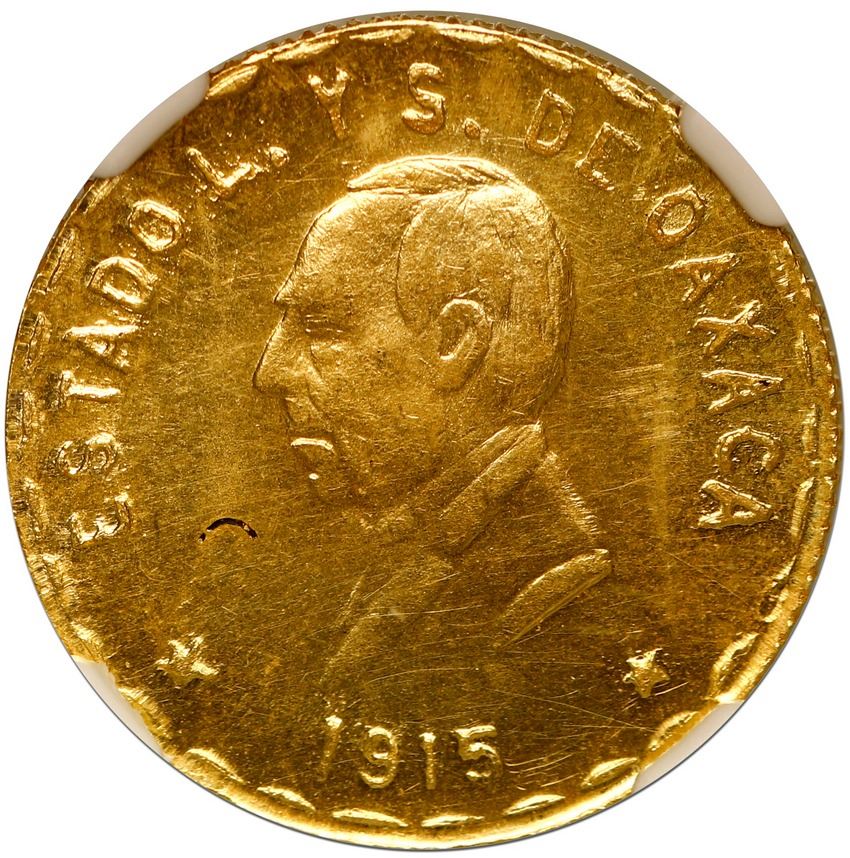 Oaxaca, Mexico, gold 10 pesos, 1915 TM, fifth bust, NGC MS 65. KM-752. Well struck in light yellow gold (0.175 fine) with brilliant luster, no toning but with small black arc in front of Juarez's chin, scarce revolutionary issue in choice grade, tied with two others for second finest in the NGC census behind a single MS 66+.