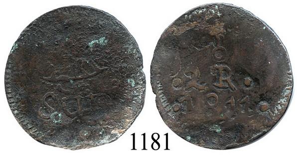 Oaxaca (SUD/Morelos), Mexico (War for Independence), copper 2 reales, 1811, scarce. KM-226.1. 4.8 grams. Large-flan Fine with flat spots as usual, spots of green, scarce first year of issue.