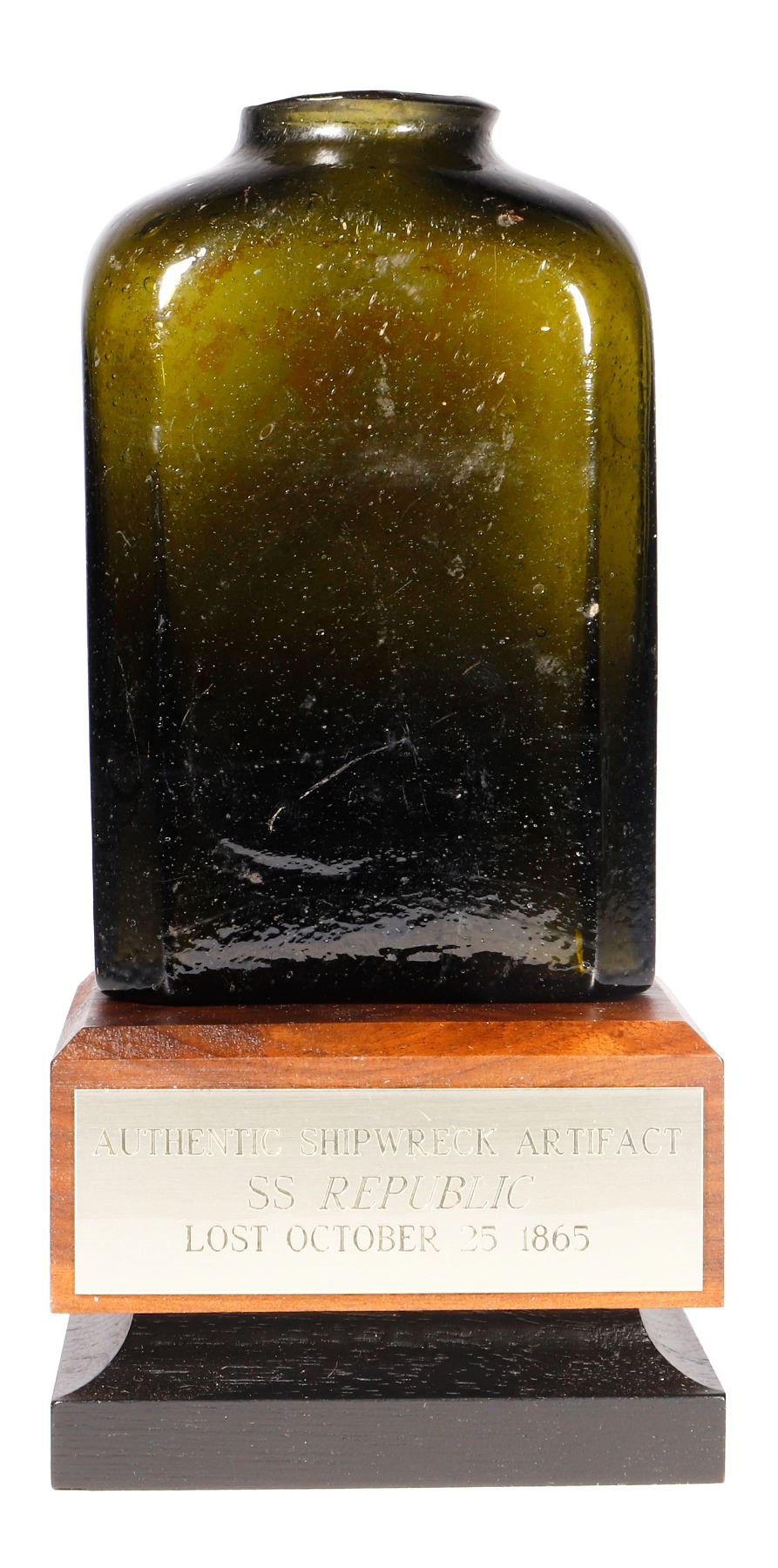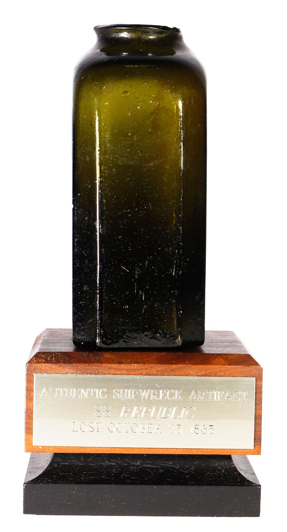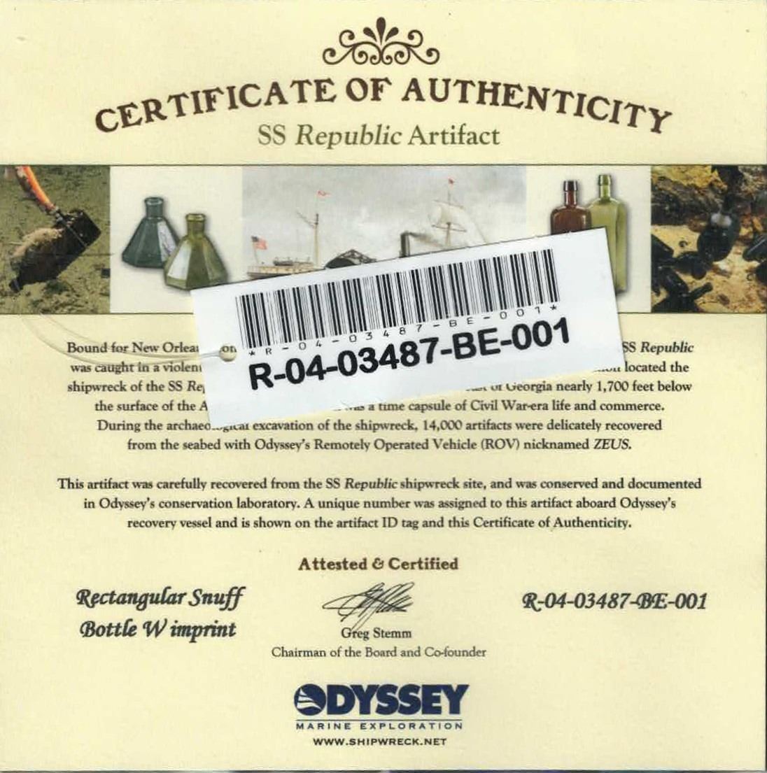 Octagonal dark brown glass snuff bottle with W imprint, with stand, ex-S.S. Republic (1865). 172 grams. 4" tall x 2½" x 1½". Touted as a cure for "Nearly All Common Diseases of the Head, Except Wrong-Headedness," a nearly unmarked bottle (W imprinted on bottom) that contained tobacco, which became popular as a cure in the early 1830s. From the S.S. Republic (1865), with original tag and certificate R-04-03487-BE-001 from the salvors.