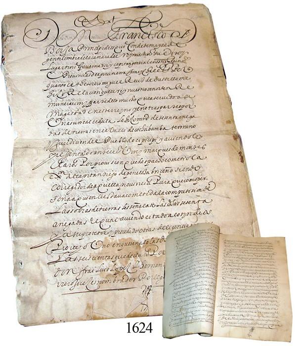 Old Spanish colonial document from Bolivia dated 1619. 8¾" x 12½". A lengthy (57 pages on 29 sheets) legal document in flowing script detailing an important government appointment, with the name "Don Francisco" in large writing at top and date on addendum sheet at end after signatures, great condition, typically unbound from official records books with lots of original string remaining.