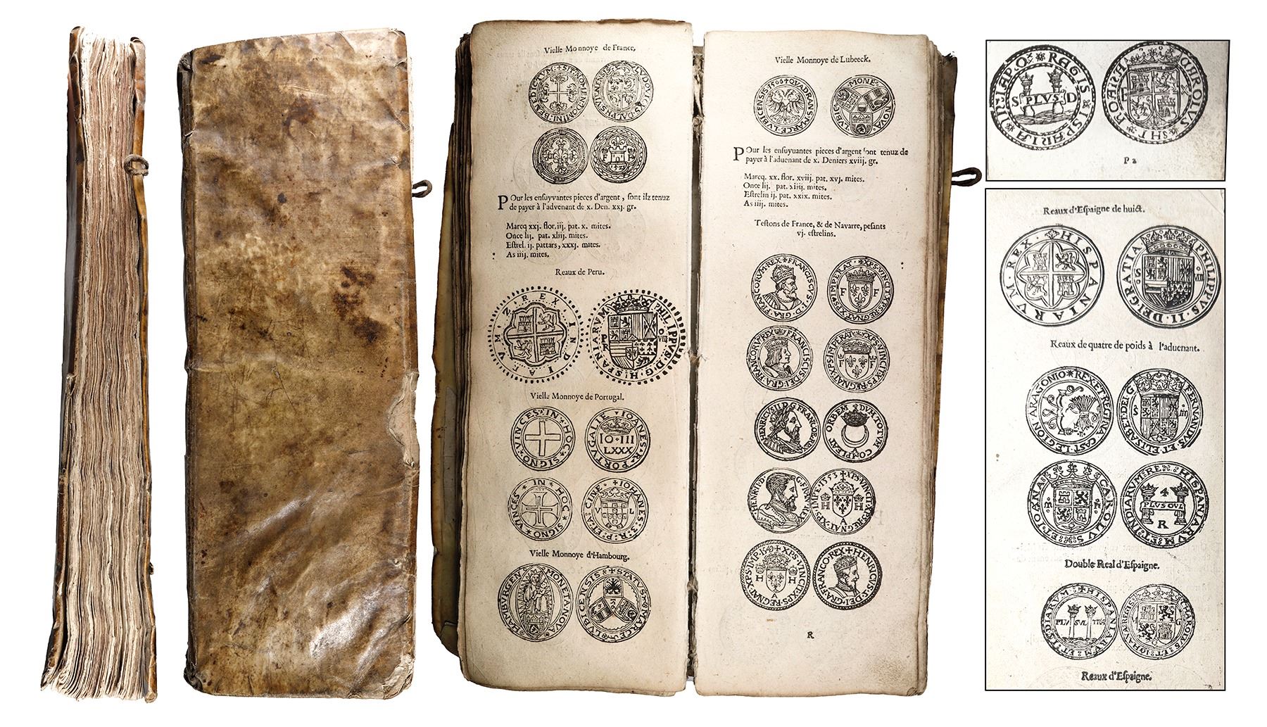 Ordonnance et Instruction, published by Chez Hierosme Verduffen, 1633, ex-Busto. 12" x 4" x 1". Described as a manual of "ordinance and instruction according to which money changers or collectors of gold and silver pieces shall hereafter conduct and regulate themselves," and issued by the Council of Finances of the Habsburgs to prevent money changing fraud, illegal speculation, or altering the value of currency and published in Antwerp. In original, fair condition, with handmade binding, liberally illustrated. A drawing of the Santo Domingo 10 reales is a reproduction of the earliest representation from 1576, in Plantin and Parijs. Pedigreed to the José Busto Collection.