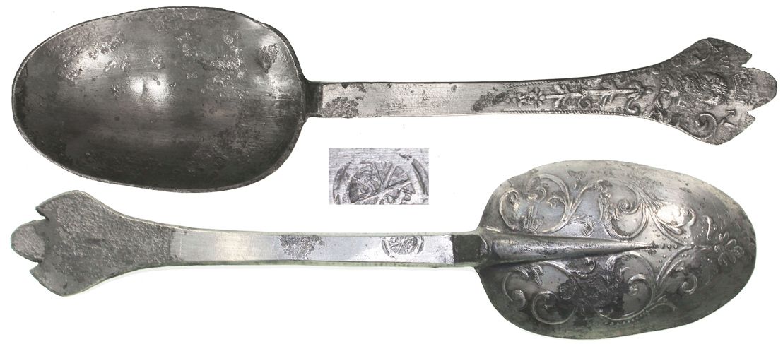 Ornate "Royal Portrait" pewter spoon, British, William III, rare and important slave-ship provenance. 42.3 grams, 7" long. A very elegant spoon (pied-de-biche type, trifid handle), with crowned head of William III at end, circular maker's mark with S-B and asterisk for Stephen Bridges of London on bottom near bowl, the underside of which is ornately designed, even gray color with a few dark spots, perfectly intact. While some 131 spoons were recovered from this wreck, only 72 were of this Royal Portrait design. The Henrietta Marie was heavily touted by the Fisher organization as the first and only slave ship found and salvaged and therefore of utmost archeological importance. With Treasure Salvors certificate #HMS48-31 from 1987. Recovered from: Henrietta Marie, sunk in 1700 off Marquesas Key, southwest of Key West, Florida