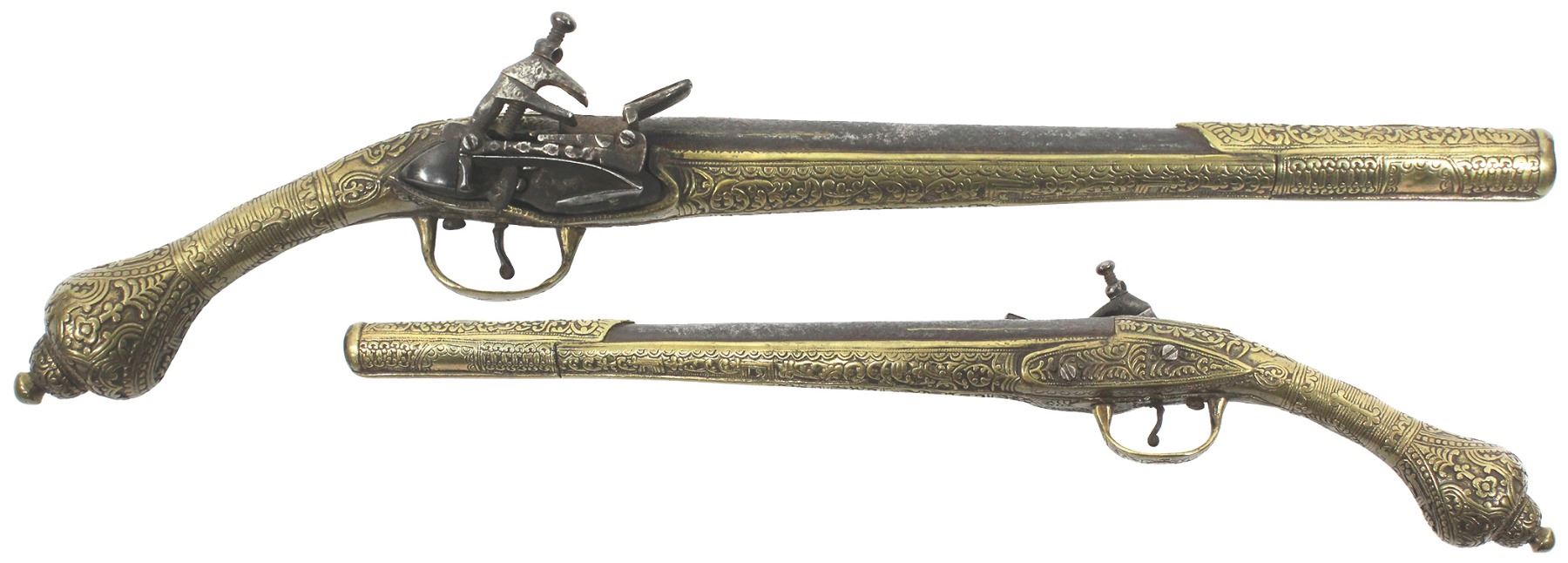 Ornate brass miquelet horseman's pistol, Eastern European, 1700s. 1512 grams, 20" long, 13" barrel. Heavily decorated metal stock with extensive brass repousse overlay mounts, brass butt cap with knob at end, engraved brass trigger guard, pierced brass side plate, ramrod missing, overall good condition.