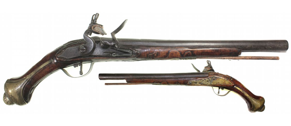 Ornate flintlock pistol, North African / Mediterranean, ca. 1750s. 1078 grams, 20" long. Round barrel with raised design and shield-shaped touch-mark on top; brass furniture with unusually protruding butt-plate and the sideplate crudely repaired in its time; simple trigger-guard and ramrod, both replacements; elegantly carved wooden stock; the lock itself in good working order.