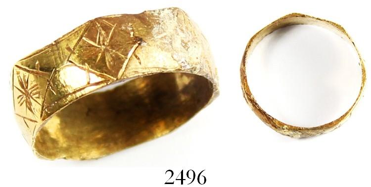 Ornate gold ring (wedding band). 5 grams, size 9. Typically thin, 7-sided design with diamond-shaped panels, mostly lustrous but partially encrusted. From the Spanish 1733 Fleet, Florida Keys, pedigreed to the Marty Meylach collection.