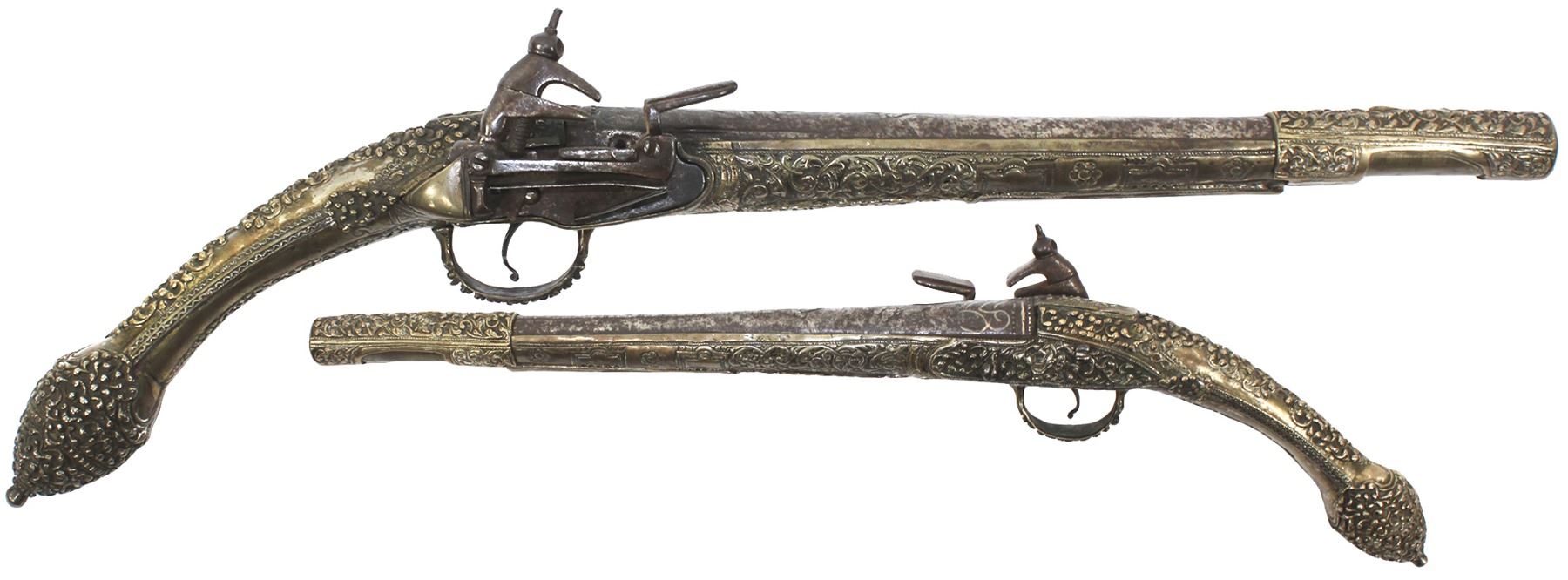 Ornate miquelet horseman's pistol, Eastern European, 1700s. 1073 grams, 19" long, 12" barrel. Intricately decorated metal stock with extensive silver repousse overlay mounts, silver butt cap with knob at end, ramrod missing, crack in repousse on underside by ramrod but overall good condition.