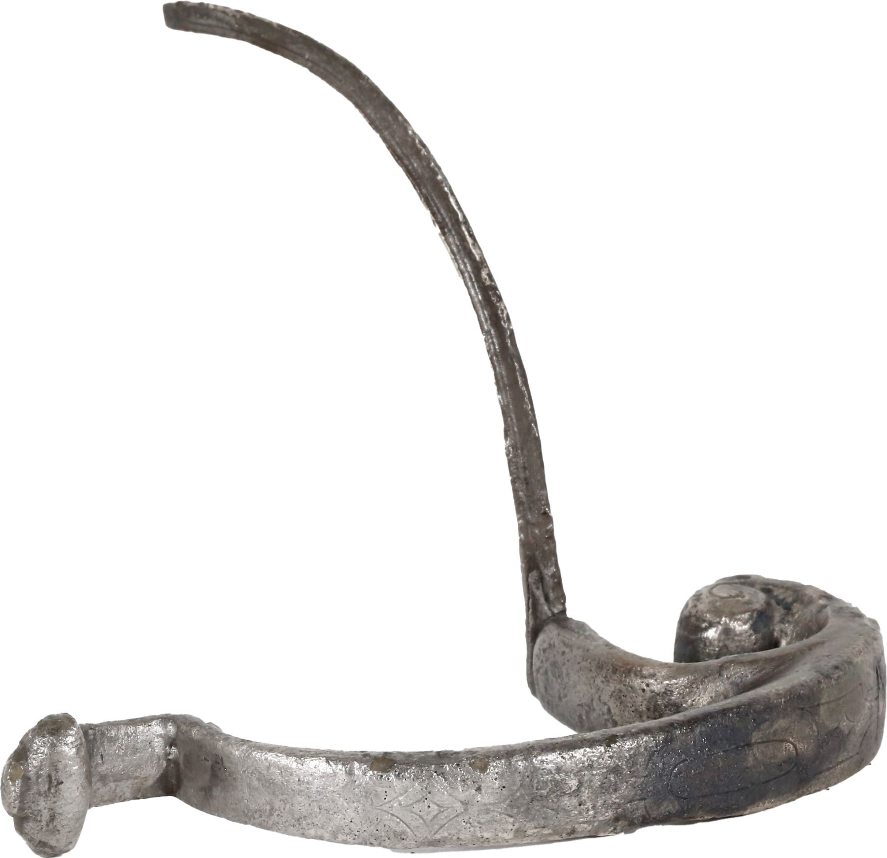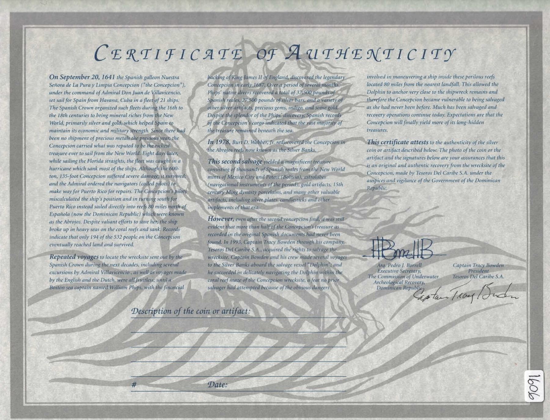 Ornate silver handle, intact, ex-Concepción (1641). 122 grams. roughly 4¾" x 4". Silver handle or some sort of drawer pull, minimally corroded and still bearing faint lines of etched decorations on the C-shaped handle ending in a curl. From the Concepción (1641), with original certificate from Captain Tracy Bowden through his contract with the Dominican Republic, and accompanied by the July 1996 issue of National Geographic signed by Captain Tracy Bowden on his article "Gleaning Treasure from the Silver Bank."