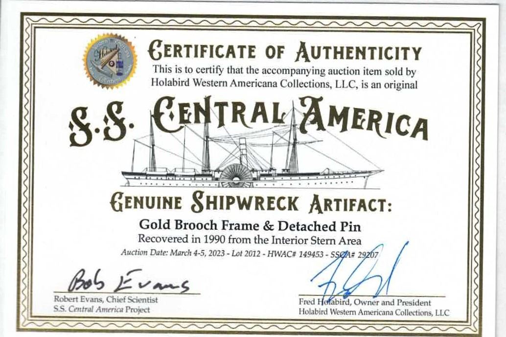 Oval gold brooch frame and detached pin, ex-S.S. Central America (1857). 8 grams total. 2" x 1½" oval. A very well-preserved—as pretty as the day it was made—small gold oval brooch frame with petite rope design around perimeter and 1¾"-long pin for attaching to a garment, loop on one side and hinge on the other, XRF tested at 16K gold (solid). From the S.S. Central America (1857), pedigreed to the Holabird auction of March 2023, with small certificate and lot card and packaging (lot 149453).