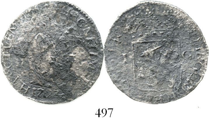 Overijssel, United Netherlands, 1 gulden, 1723. KM-63.3. 6.6 grams. Moderately to heavily corroded but with discernible date and mintmark, mostly darkly toned, very scarce type for shipwreck salvage. With certificate from the salvager (Stenuit). From the Slot ter Hooge, sunk in 1724 off Porto Santo, Madeira Islands