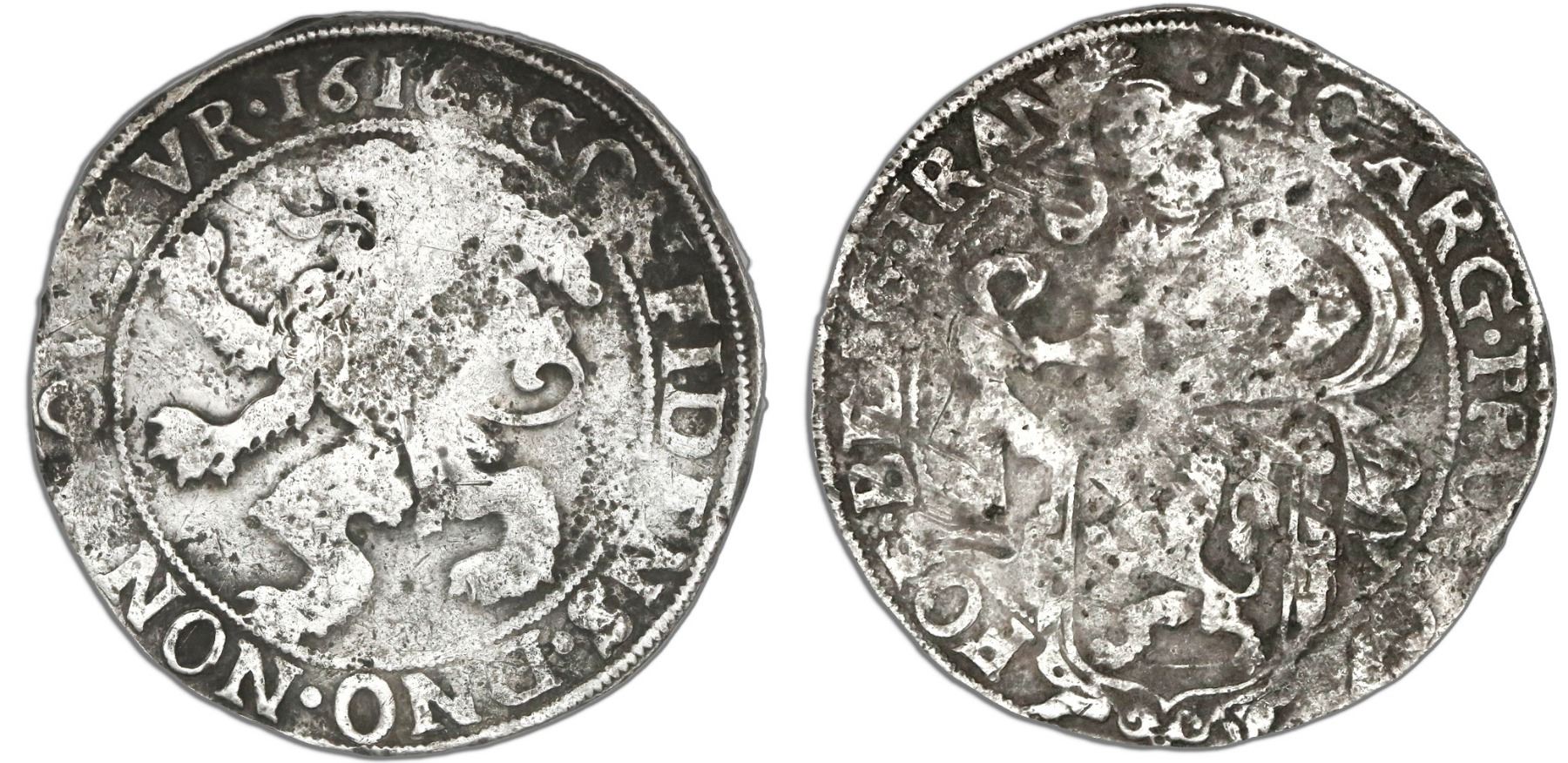 Overijssel, United Netherlands, "lion" daalder, 1616. KM-12. 25.85 grams. Nearly full legends (mostly bold, particularly the date), full but weaker inner details, toned in crevices, light surface corrosion on knight side. Recovered from: Campen, sunk in 1627 off Isle of Wight, south of England