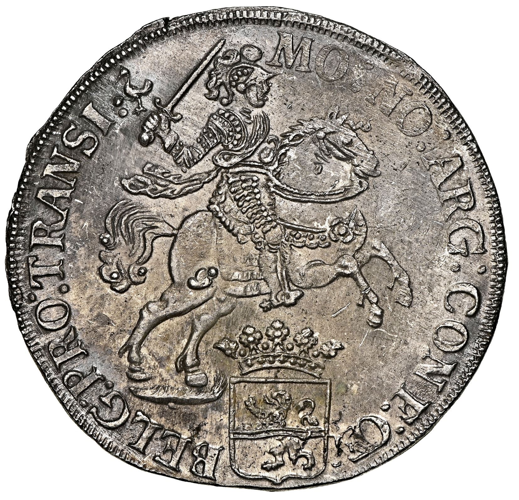 Overijssel, United Netherlands, "rider" ducatoon, 1734, NGC UNC details / saltwater damage / Vliegenthart (Shipwreck Label). KM-80; Dav-1829. Very sharp and lustrous, with lovely gunmetal toning, practically no evidence of pitting or corrosion. NGC #6289300-014. From: Vliegenthart, sunk in 1735 off Zeeland, Netherlands