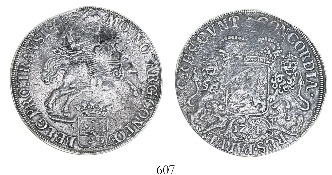 Overijssel, United Netherlands, "rider" ducatoon, 1734. KM-80. 32.12 grams. Minimal surface corrosion and superb full details as usual, also nicely toned, but lightly polished at some point. Recovered from: Vliegenthart, sunk in 1735 off Zeeland, the Netherlands
