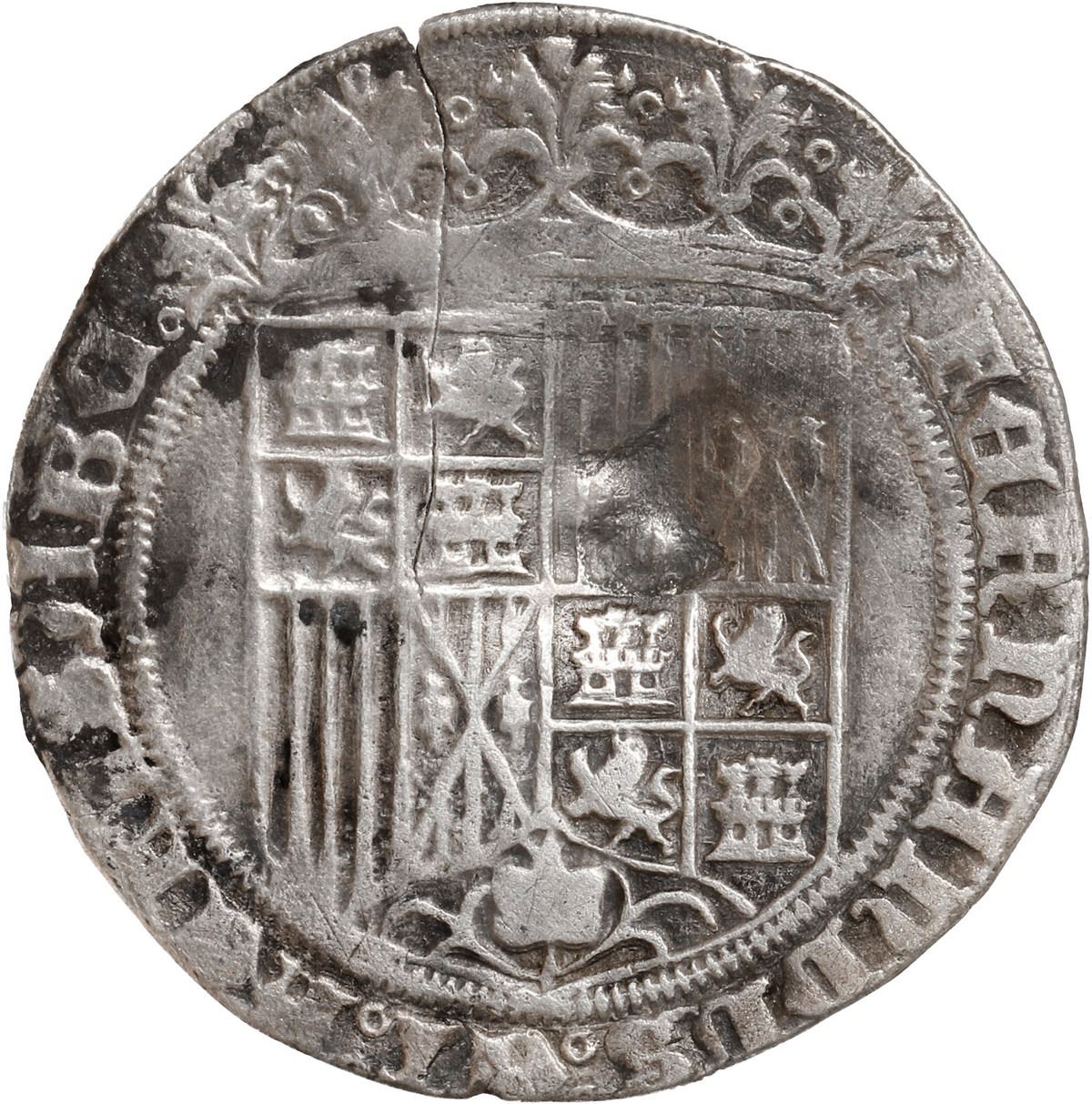 PANAMA, 1 real, countermark P on a Burgos, Spain, 1 real of Ferdinand-Isabel, assayer scallop at top, mintmark B below yoke on reverse, rare. Host: López de la Fuente-F1.4.2.5; Cal-301. 3.08 grams. Very deeply impressed full countermark (incuse) on shield, the host with complete legends and inner details, VF with toning in crevices, a desirable example of this rare and uncataloged countermark issue.