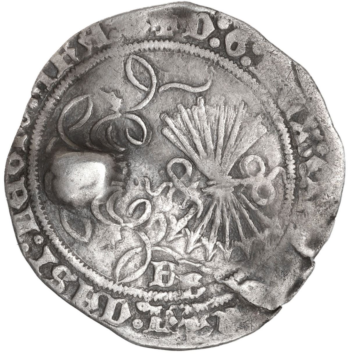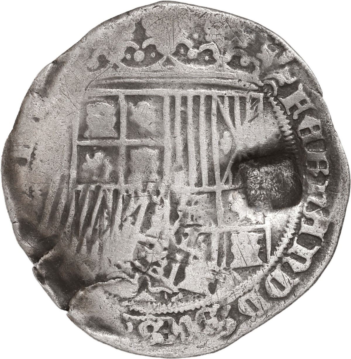 PANAMA, 1 real, countermark P on a Burgos, Spain, 1 real of Ferdinand-Isabel, assayer scallop at top, mintmark B below yoke on reverse, rare. Host: López de la Fuente-F1.4.2; Cal-301. 3.10 grams. Very deep but somewhat indistinct countermark (incuse) on right side of shield, the host toned Fine with slightly uneven strike and atypically doubled bottom part of shield above an edge-split, exact variety unclear, rare and popular countermark (uncataloged).