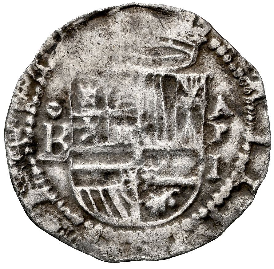 PANAMA, Panama City, cob 1 real, Philip II, assayer oB to left, mintmark AP above denomination I to right, very rare, NGC XF details / environmental damage. S-AP4; Cal-236; KM-2. 3.34 grams. Bold full oB to left and AP-I to right of full shield, the cross-lions-castles full and choice, with some crown and legend visible here and there, darkly toned in crevices, remarkable for showing the vertical bar of Aragon that is more normally omitted, die-match with Proctor 1R.5B (Plowman 1R.Bo.D).