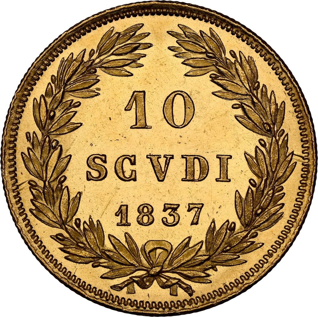 PAPAL STATES, Rome mint, gold 10 scudi, Gregorius XVI, 1837-VII, rare, NGC MS 63. Gig-9; Fr-263; KM-1108. Brilliant, almost prooflike luster with minor marks only, very choice grade (second finest in NGC census behind a single MS 64), rarely offered in MS.