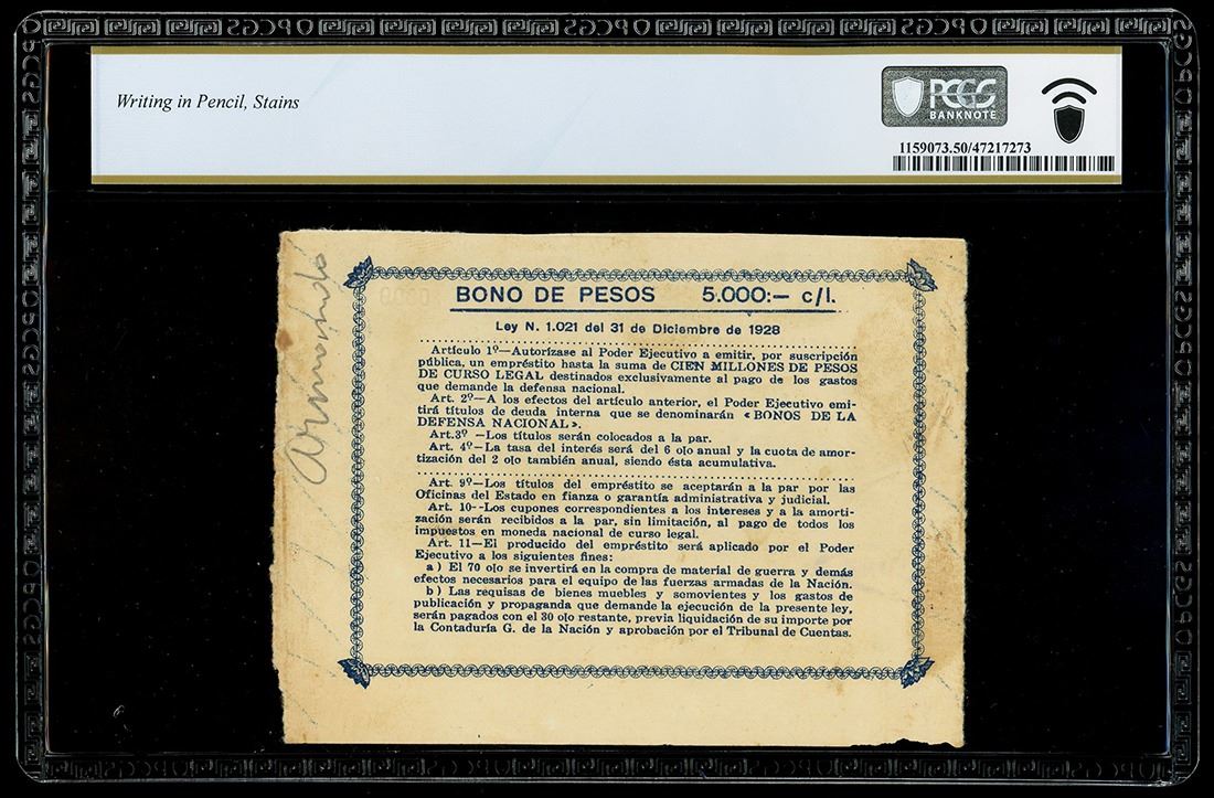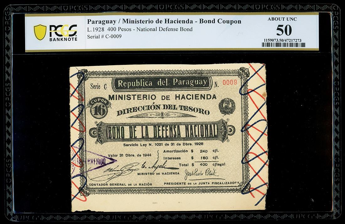 PARAGUAY, Ministerio de Hacienda, 400 pesos national defense bond, 31-12-1928, series C, serial 0009, PCGS Banknote AU 50. Boldly printed bond with interesting blue and red pattern in the left and right margins. Issued to raise funds for the defense of the nation by the Treasury of Paraguay. First example we have offered and quite rare on the market. Pencil annotation and light stains on the back margins as noted on the PCGS label.