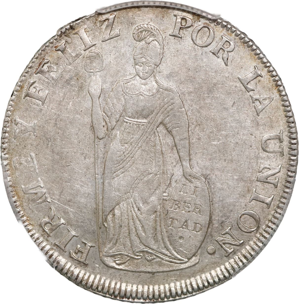 PERU, Arequipa, 4 reales, 1839 MV, coin axis, PCGS AU53, ex-Pat Johnson, ex-Americas, ex-O'Brien. KM-151.2. Some hairlines and typically soft strike on slightly off-center Liberty side, with muted luster all over, quite nice for the type. Pedigreed to the Pat Johnson Collection (stated on label, Stack's Bowers auction of November 2022, with original lot-tag 72142) and to the Americas Collection (Kagin's auction of August 1983, with original lot-tag 1357) and to the John O'Brien Collection, with his tag.