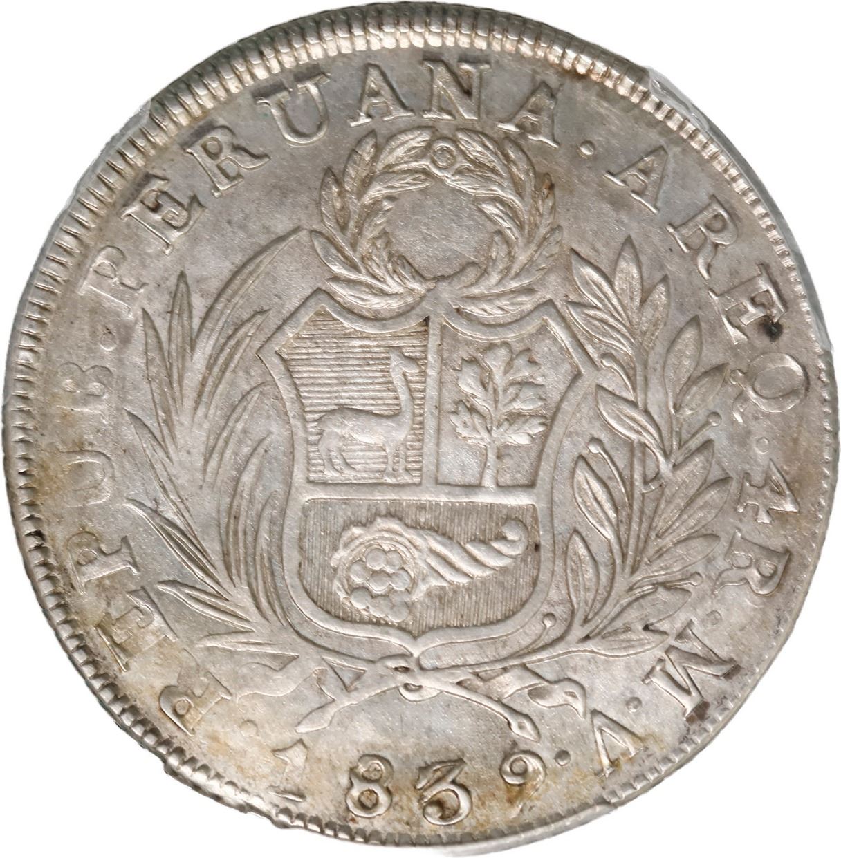 PERU, Arequipa, 4 reales, 1839 MV, coin axis, PCGS AU53, ex-Pat Johnson, ex-Americas, ex-O'Brien.