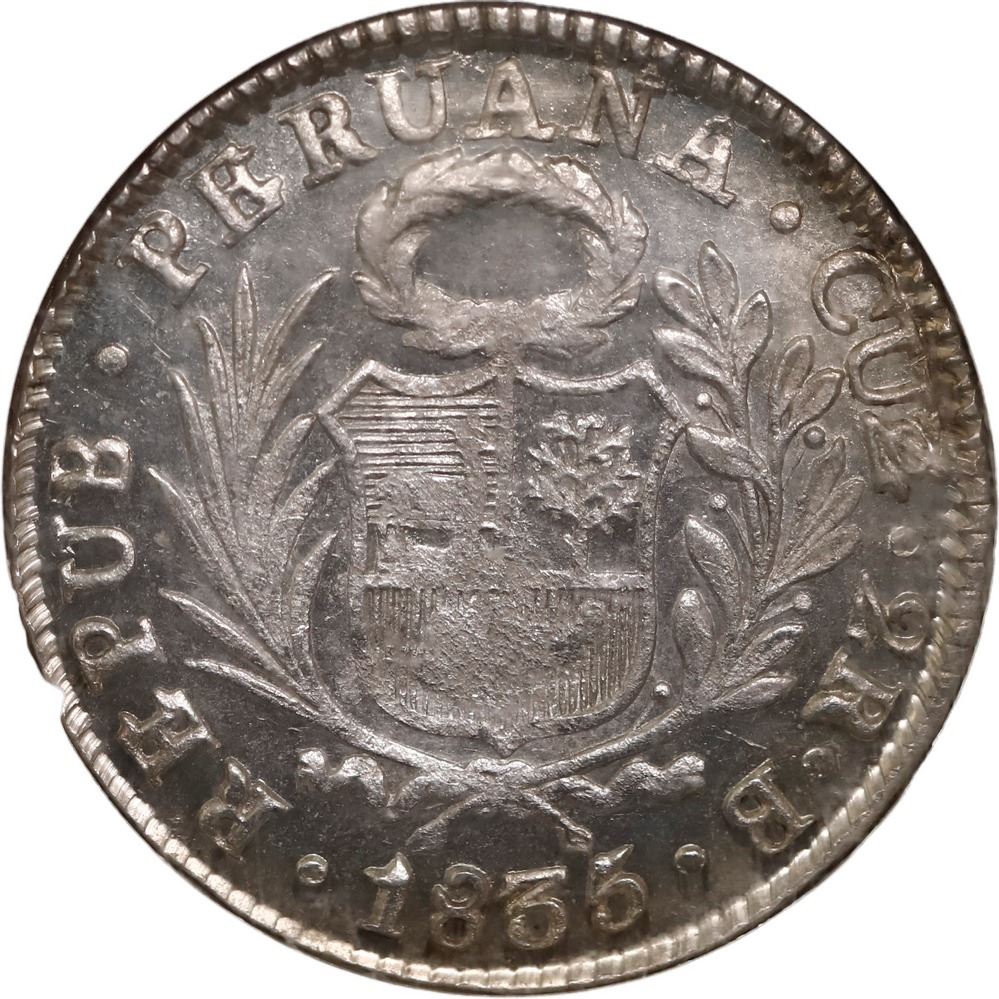 PERU, Cuzco, 2 reales, 1835 B, NGC MS 62, finest known in NGC census, ex-Whittier, ex-O'Brien.