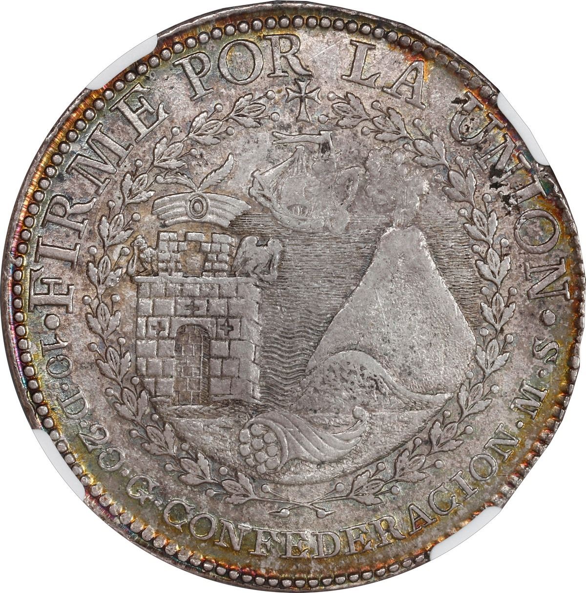 PERU, Cuzco, 8 reales, 1838 MS, NGC AU 55. KM-170.4. Choice light rainbow toning at rims (lots of blue and orange), muted luster, a couple minor edge-flaws, popular artistic sunface design with local iconography on reverse.