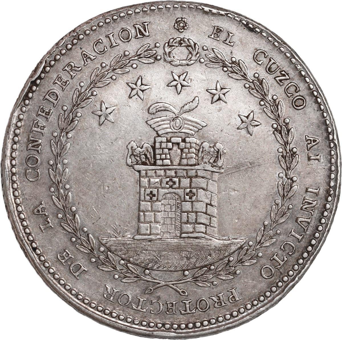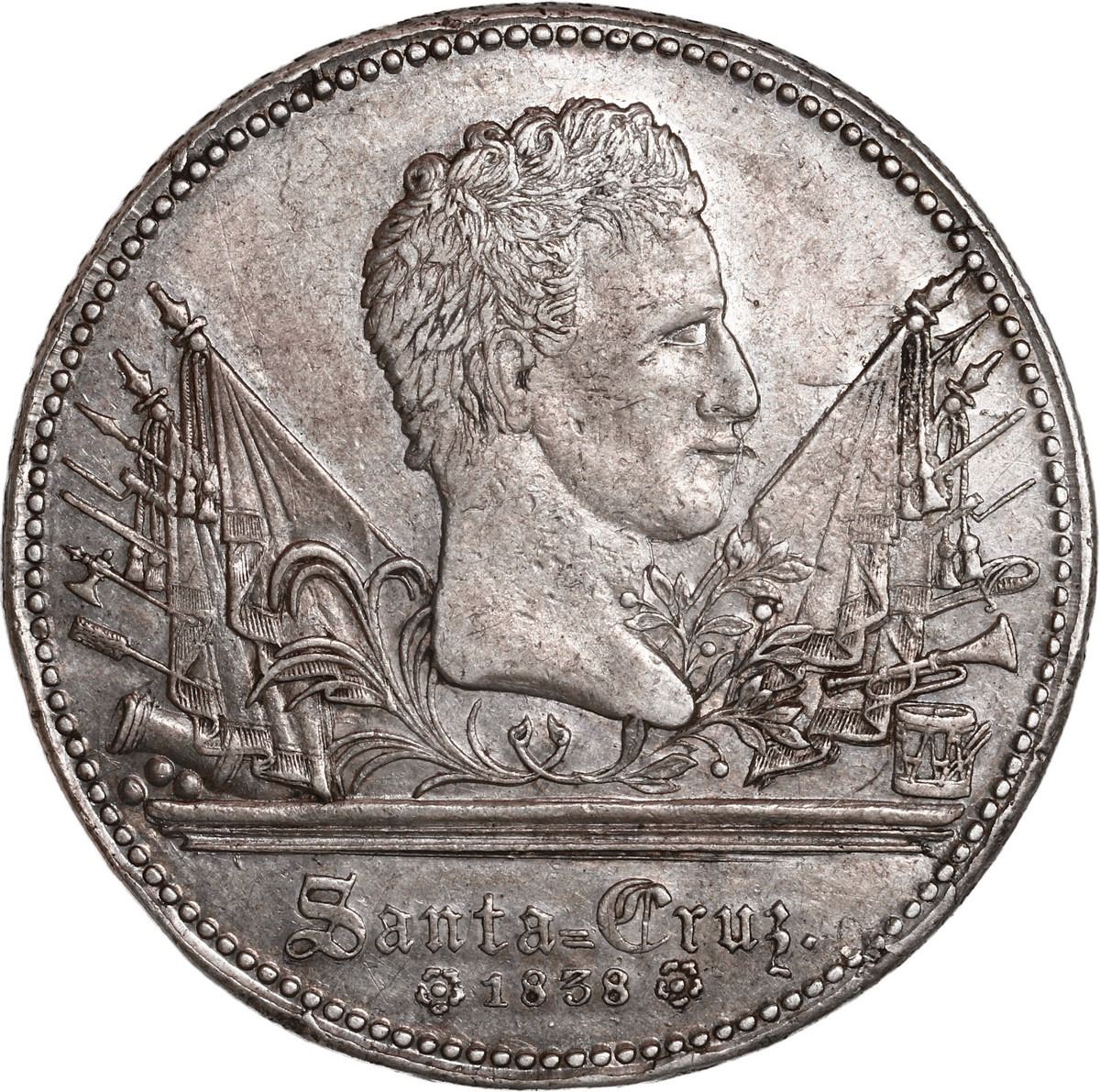 PERU, Cuzco, 8 reales-sized medal, 1838, Supreme Protector Santa Cruz. Fonrobert-9235. 27.97 grams. 39 mm. Obverse with large bust of Santa Cruz between flags, Santa=Cruz / [rosette] 1838 [rosette] in exergue; reverse with castle (arms) below stars inside wreath within legend EL CUZCO AL INVICTO PROTECTOR DE LA CONFEDERACION. Lightly toned over muted luster, AU- with light old scratches to right of castle, struck to proclaim in Cuzco the new role of Supreme Protector bestowed the year before upon military hero Santa Cruz.