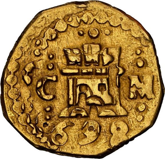 PERU, Cuzco, gold cob 1 escudo, 1698 M, extremely rare, NGC AU 58 (1715 Fleet Shipwreck Label). S-CZ1; KM-A27; Cal-811; Fr-6. 3.36 grams. Excellent full cross, slightly doubled obverse with 100% full castle, mintmark, assayer, and three-digit date, hence among the best known of the six or so known to exist (in fact second finest in the NGC census behind a single MS 62), clearly far rarer than the 2 escudos (the only other denomination struck at this mint) and missing in many important collections. Recovered from: Spanish 1715 Fleet, sunk off the east coast of Florida
