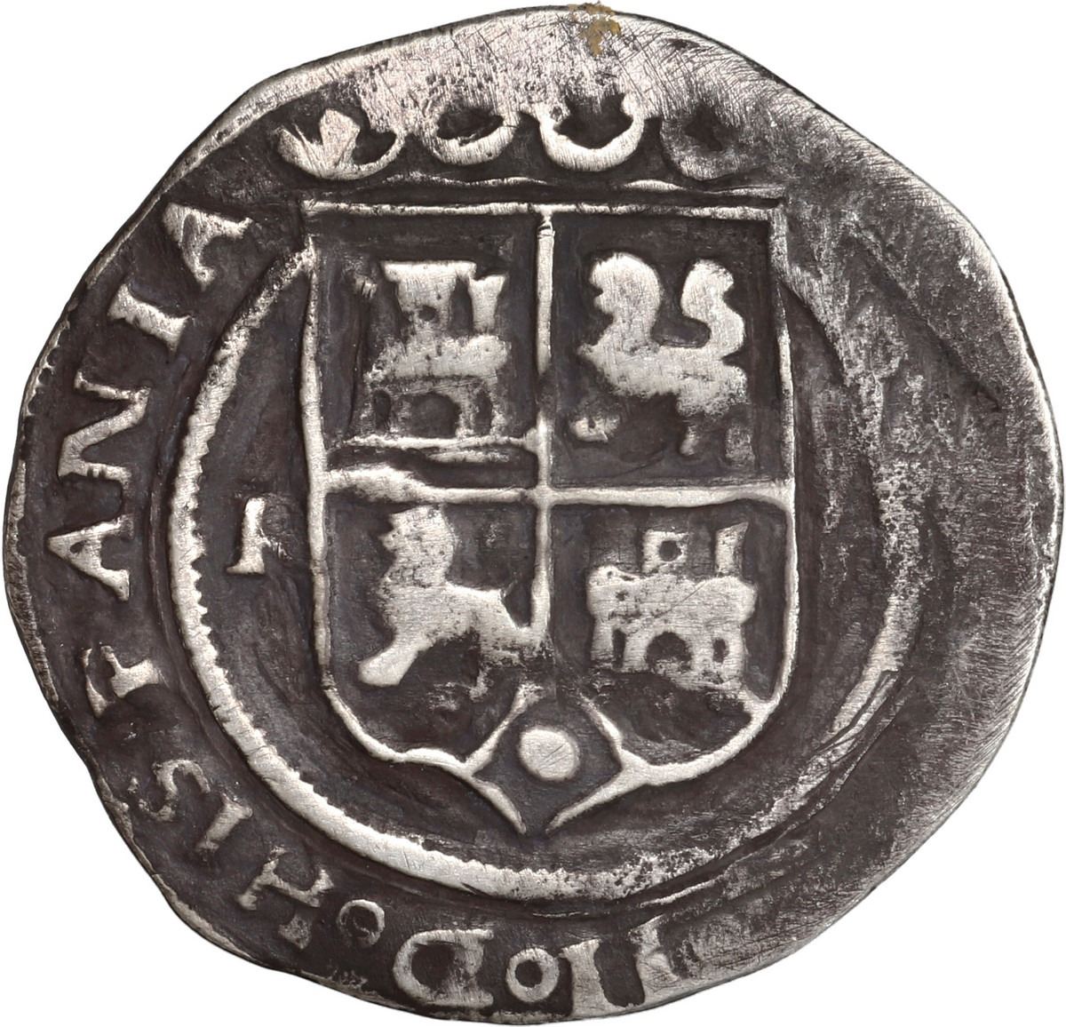 PERU, Lima, 1 real, Philip II, assayer R (Rincón) to left, legends HISPANIA / NIARVM, motto PL-VS-VL above •, ex-Ugaz. S-L1; KM-6; Cal-209. 2.77 grams. Round flan (probably lightly shaved in its time) with very bold VF details due to contrasting toning that covers old tooling marks and faint porosity. Note: Previous editions of Calicó had separate listings for both motto above dot (denomination) and motto below dot, this being the former. Pedigreed to the Jorge Ugaz Collection.