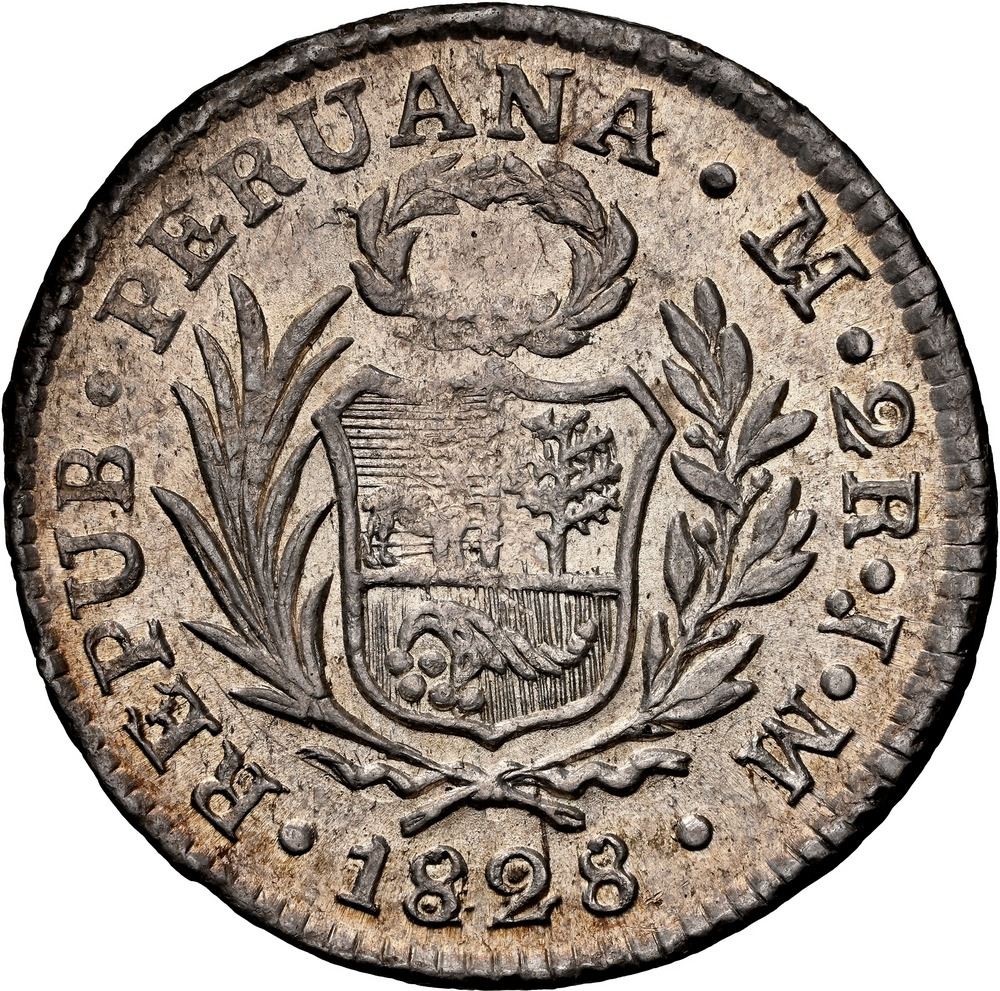 PERU, Lima, 2 reales, 1828 JM, first 8/2 in date, coin axis, NGC MS 62, ex-O'Brien.