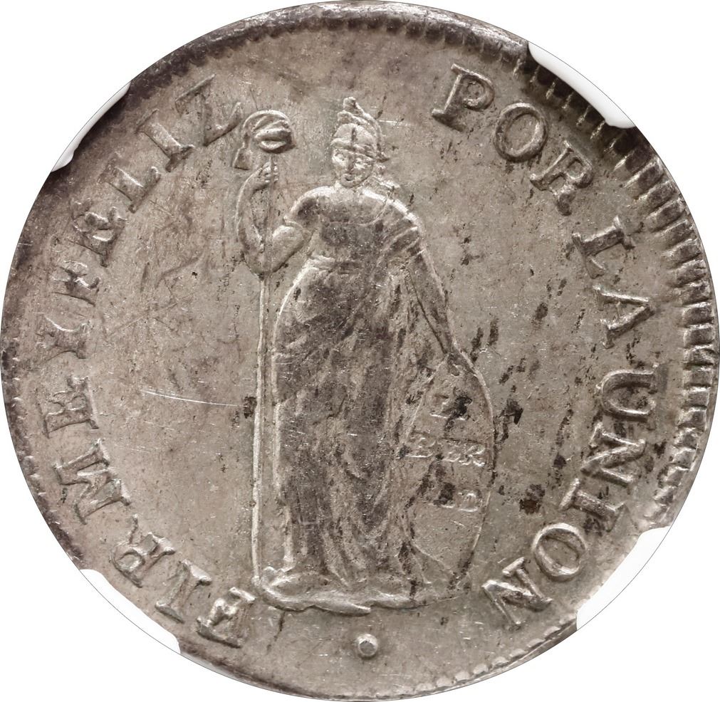 PERU, Lima, 2 reales, 1833 MM, NGC AU 55, finest and only example in NGC census. KM-141.1. Very flashy luster for the assigned grade (should be much higher, although lightly hairlined on Liberty side), good strike except for parts of rims due to centering issues, light incipient toning.