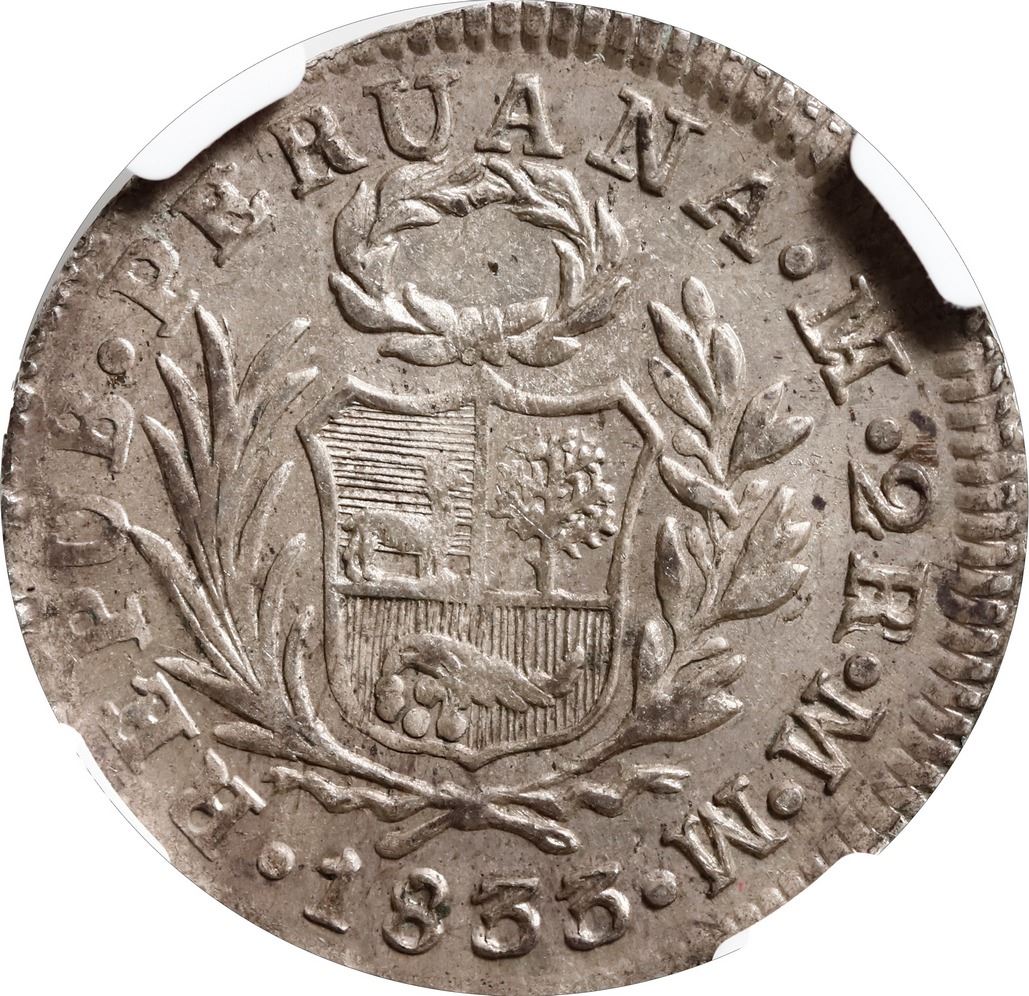 PERU, Lima, 2 reales, 1833 MM, NGC AU 55, finest and only example in NGC census.