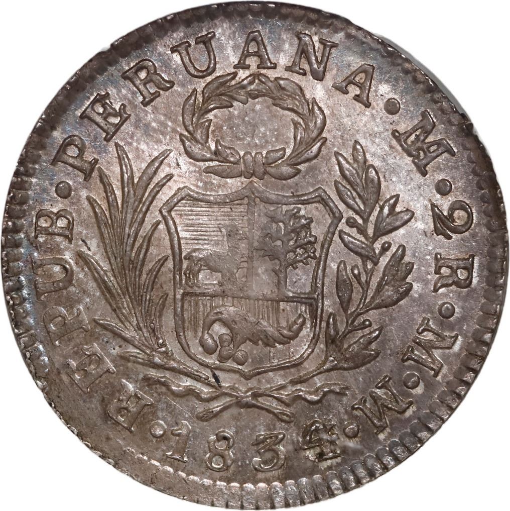 PERU, Lima, 2 reales, 1834/3 MM, NGC MS 63, finest known in NGC census, ex-O'Brien.