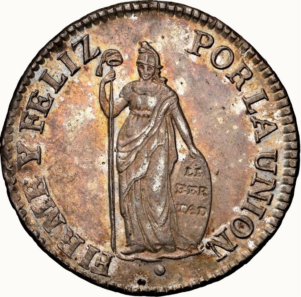 PERU, Lima, 2 reales, 1840 MB, without fineness, NGC AU 58, finest and only example in NGC census, ex-O'Brien. KM-141.1. Choice luster overlain with deep, splashy rainbow toning, well struck except for parts of rims, really looks higher grade but nevertheless the finest known for this final date of the no-fineness type. Pedigreed to the John O'Brien Collection (stated on label), with his tag.