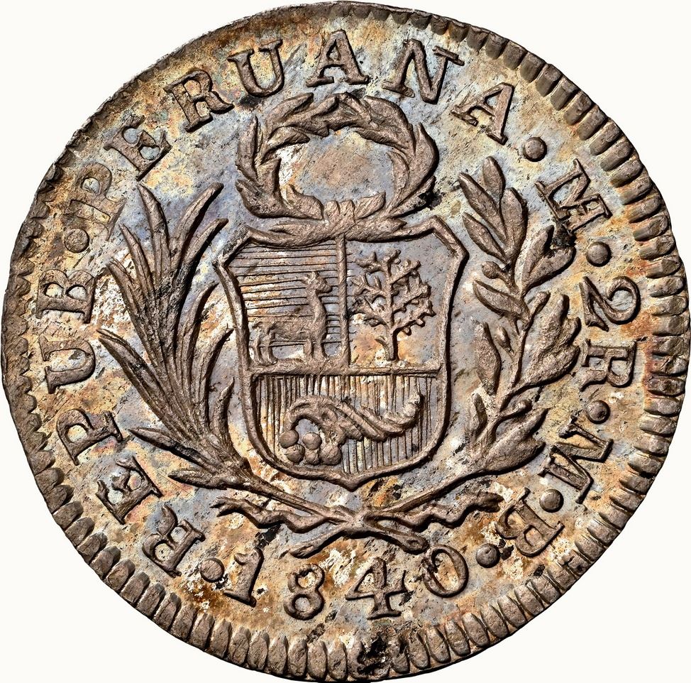 PERU, Lima, 2 reales, 1840 MB, without fineness, NGC AU 58, finest and only example in NGC census, e