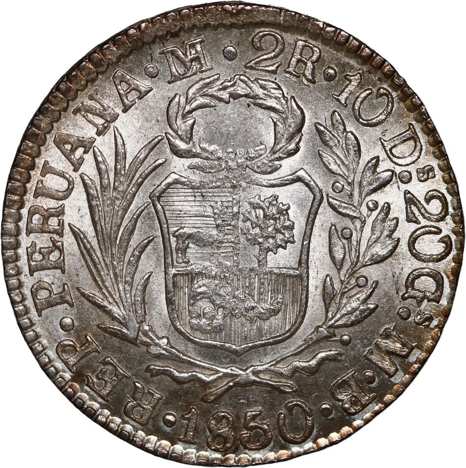 PERU, Lima, 2 reales, 1850 MB, no tassel on cap, NGC MS 63, ex-O'Brien.