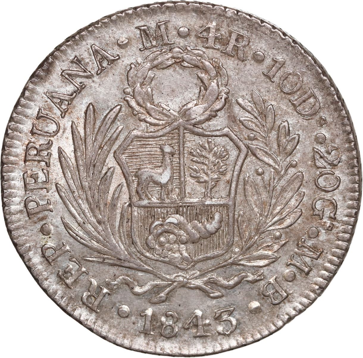 PERU, Lima, 4 reales, 1843 MB, NGC AU 58, finest known in NGC census, ex-O'Brien.