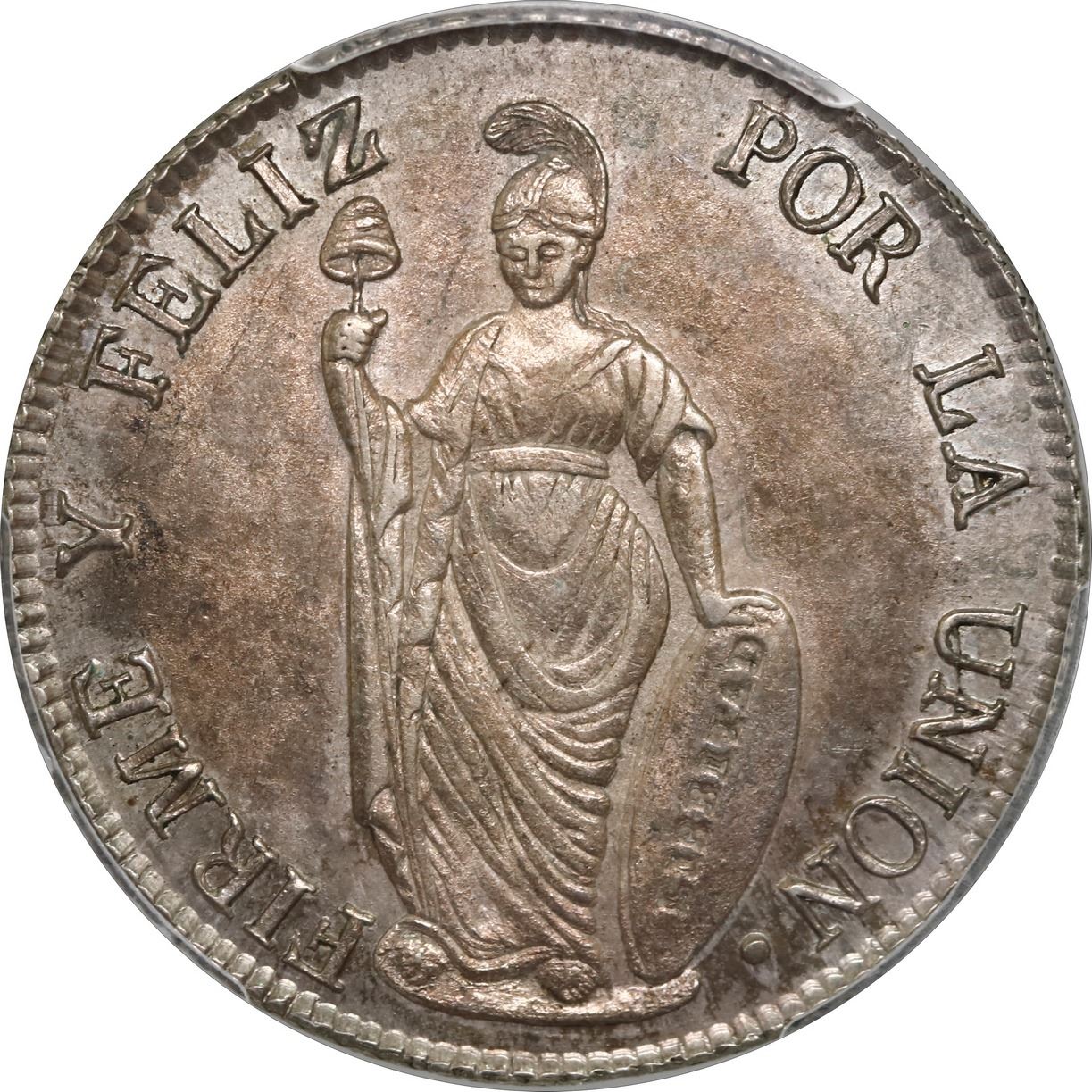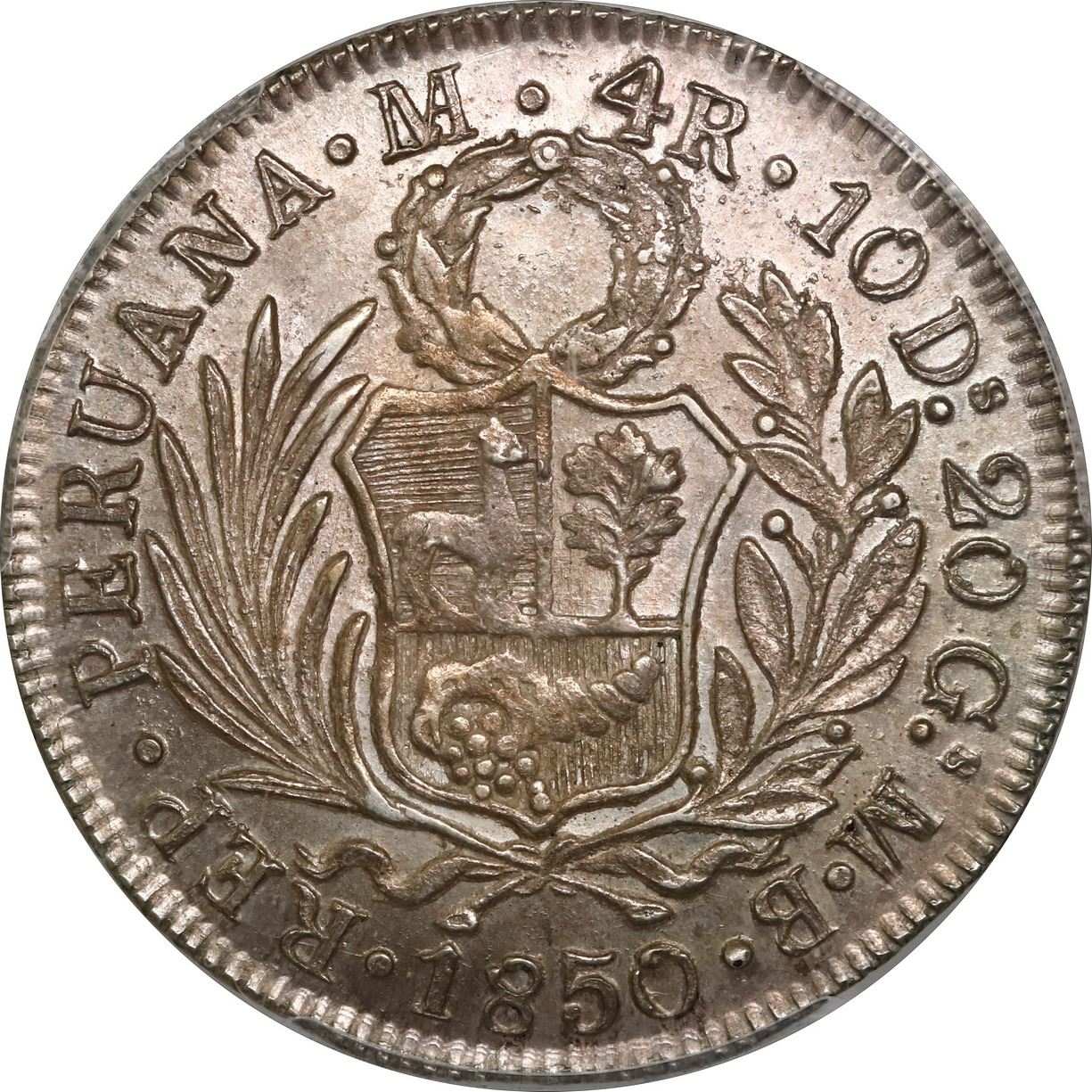 PERU, Lima, 4 reales, 1850 MB, PCGS AU58, ex-O'Brien. KM-151.3. Choice strike with very light rainbow toning over ample luster, only light high-point wear and the faintest of hairlines. Pedigreed to the John O'Brien Collection.