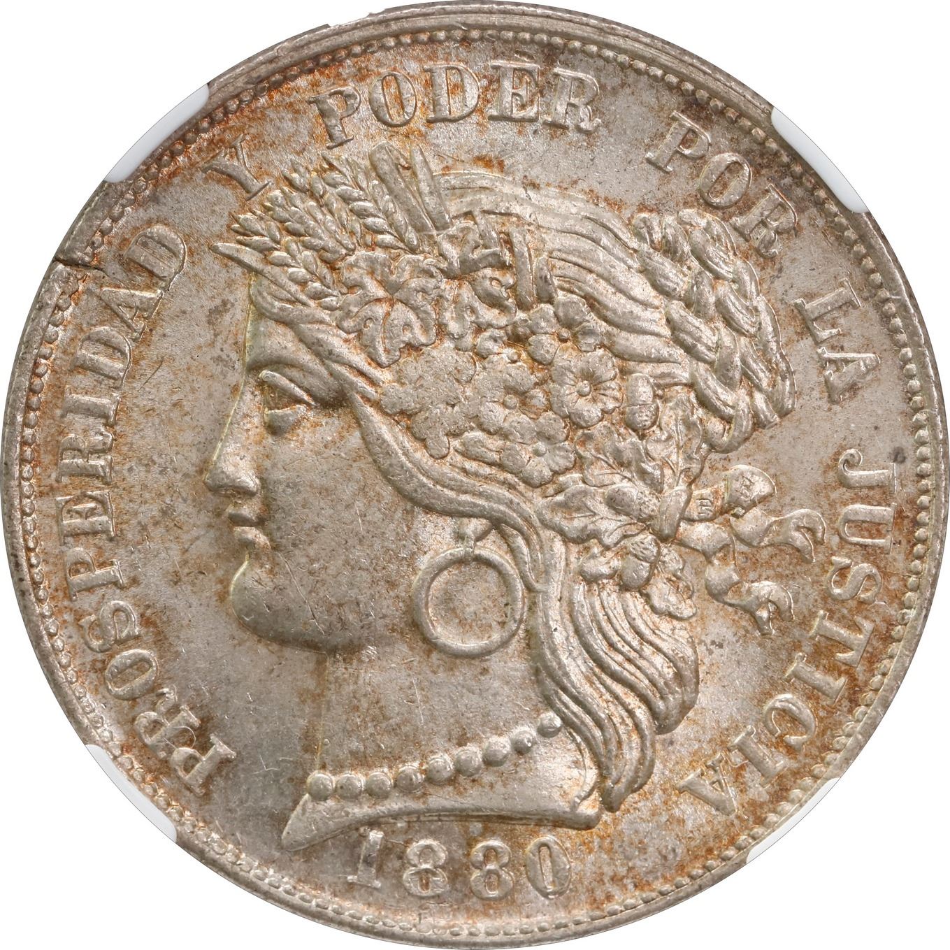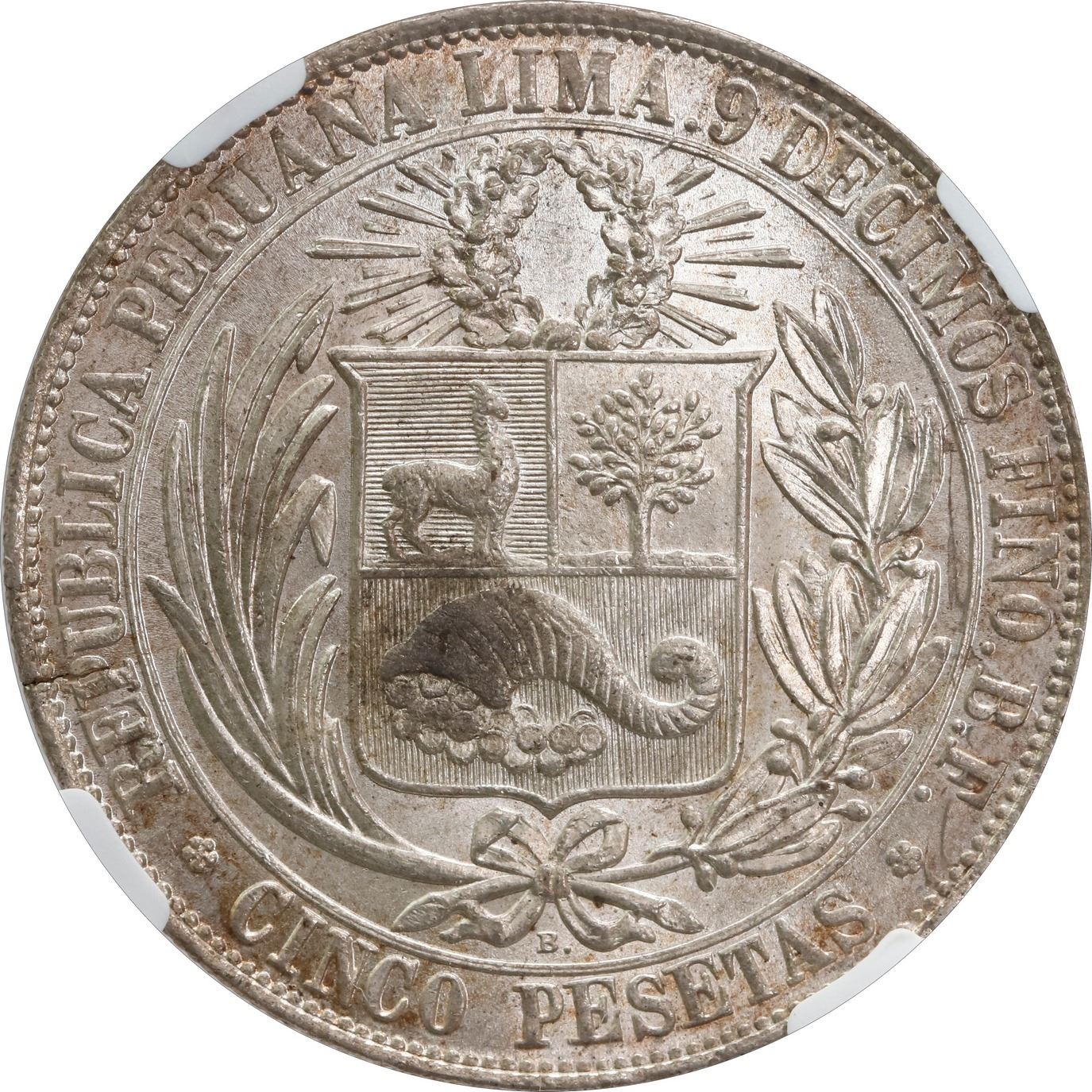 PERU, Lima, 5 pesetas, 1880 BF, with dot after B, NGC MS 63. KM-201.2. Choice cartwheel luster with spots of red-orange toning all over, a few hairlines and edge-crack but otherwise rather desirable quality for this brief type.