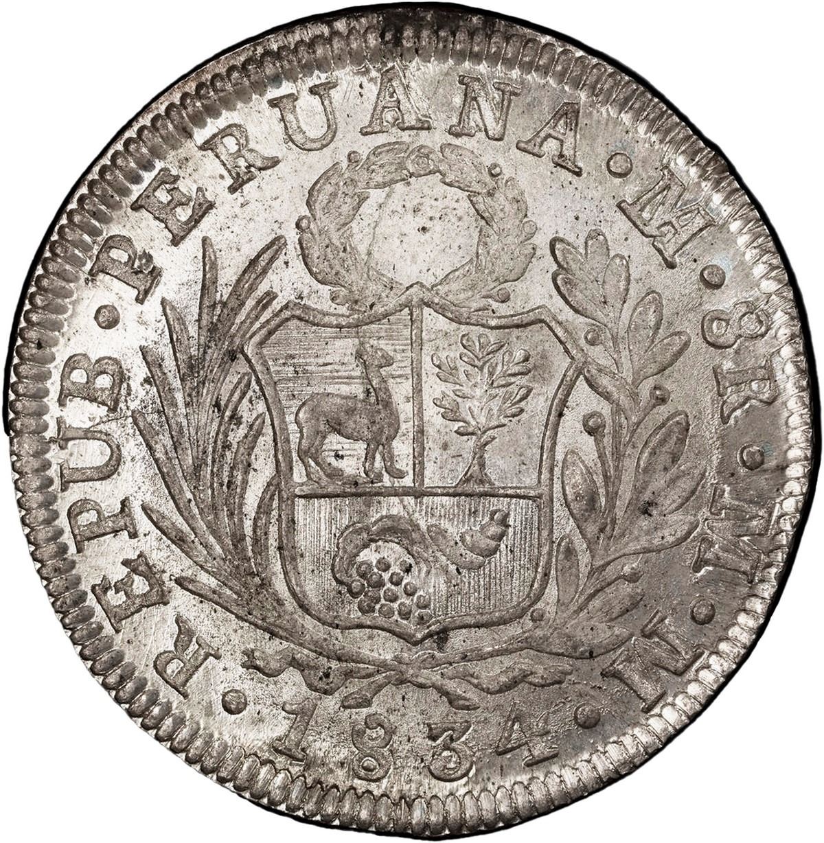 PERU, Lima, 8 reales, 1834 MM, PCGS MS64. KM-142.3. Bright white luster and frosty details, tiny speckles of toning, well-detailed strike with full rims.