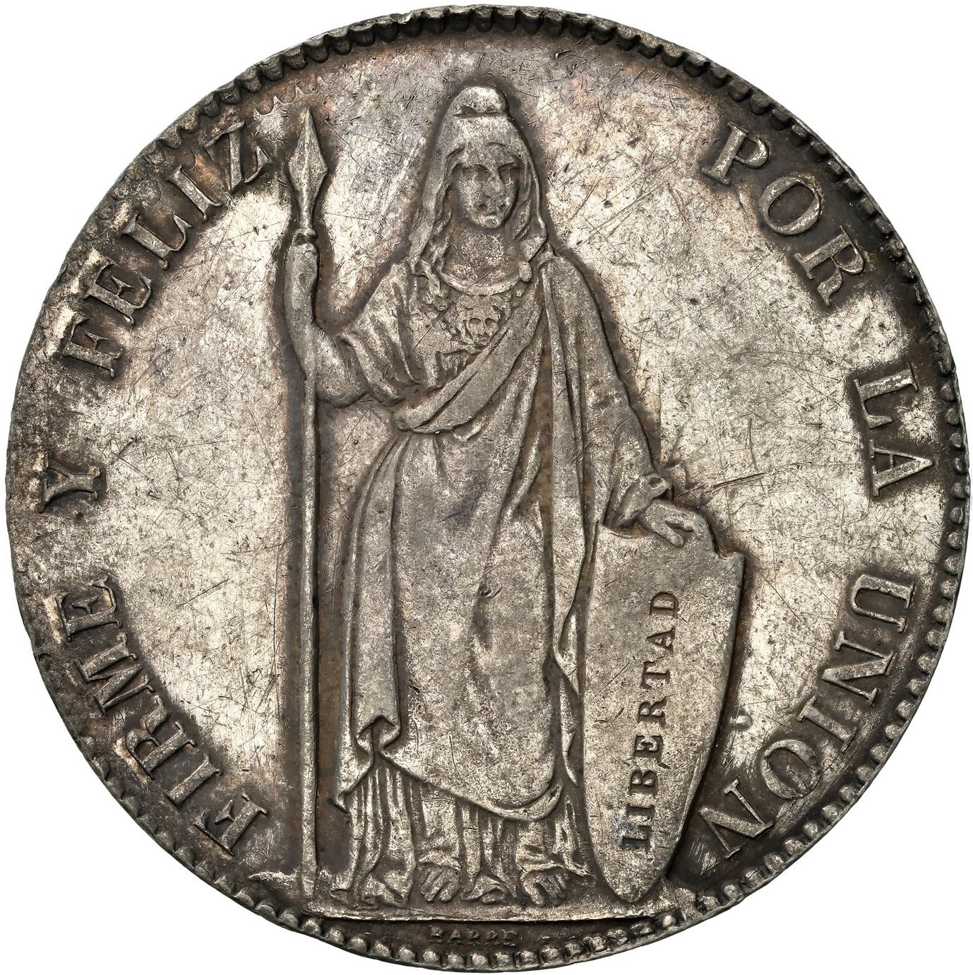 PERU, Lima, 8 reales, 1841 MB, REPUB• PERUANA, extremely rare, PCGS XF details / cleaned, finest and only example in PCGS census. KM-142.10. First date of new Liberty type with REPUB instead of REP (defined at NGC as "large wreath," which is another characteristic), an important key in the Peruvian crown series, this example with lustrous fields (hairlined, of course, but also with some stray old marks) and nicely contrasting toning, first example we have seen since the Sellschopp specimen in the September 1988 Swiss Bank Corp. auction (which was described as "Probably unique!"), a very important coin for the Peruvian or Latin American specialist or world crown collector.