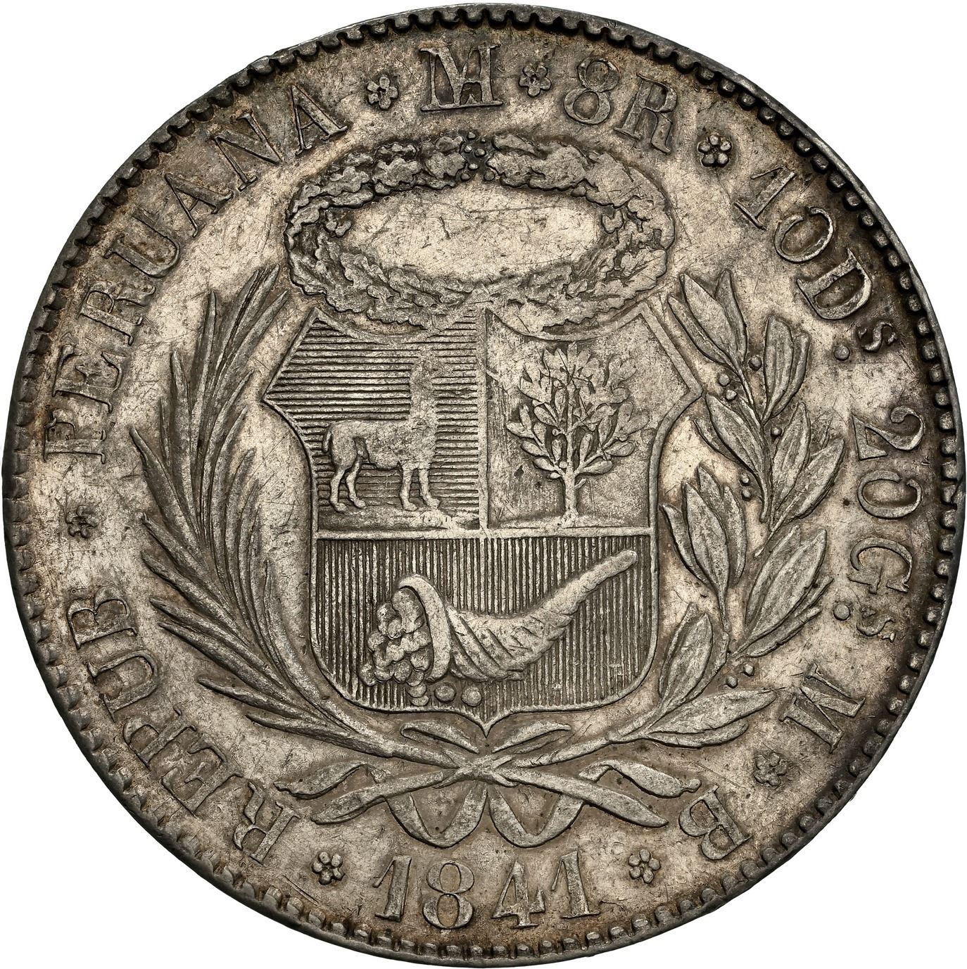 PERU, Lima, 8 reales, 1841 MB, REPUB• PERUANA, extremely rare, PCGS XF details / cleaned, f