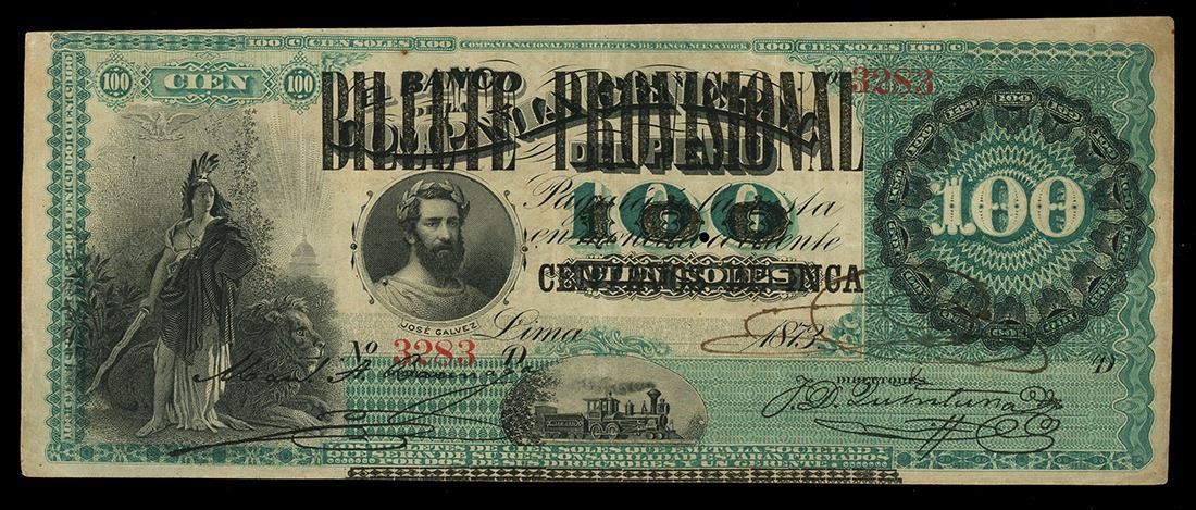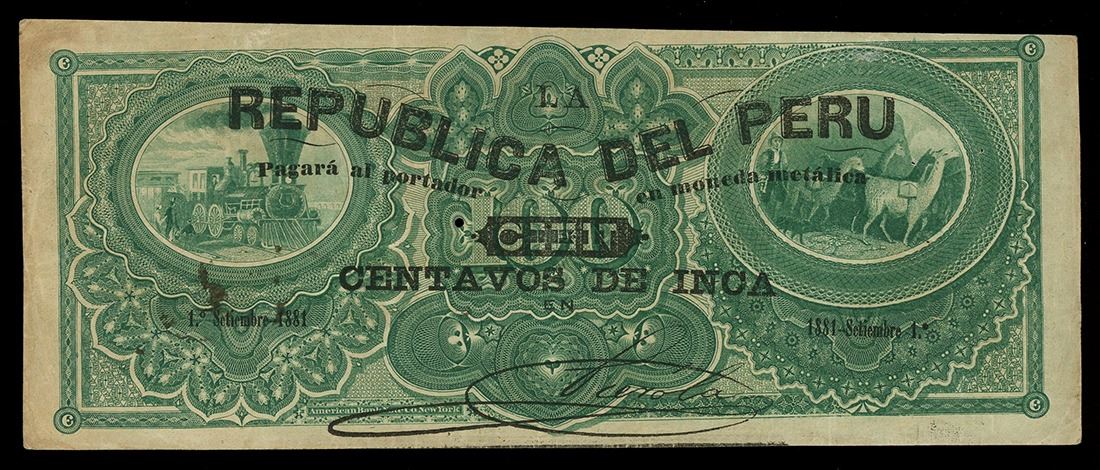 PERU, Lima, República del Peru, 100 centavos de Inca, 1-1-1881, serial 3283, black overprint on 1873-dated Banco de la Compañía General del Peru 100 soles remainder. Pick-13. Very bold printing and overprint on this high denomination note, grading Very Fine with a pair of staple holes at left and a small hole in center.