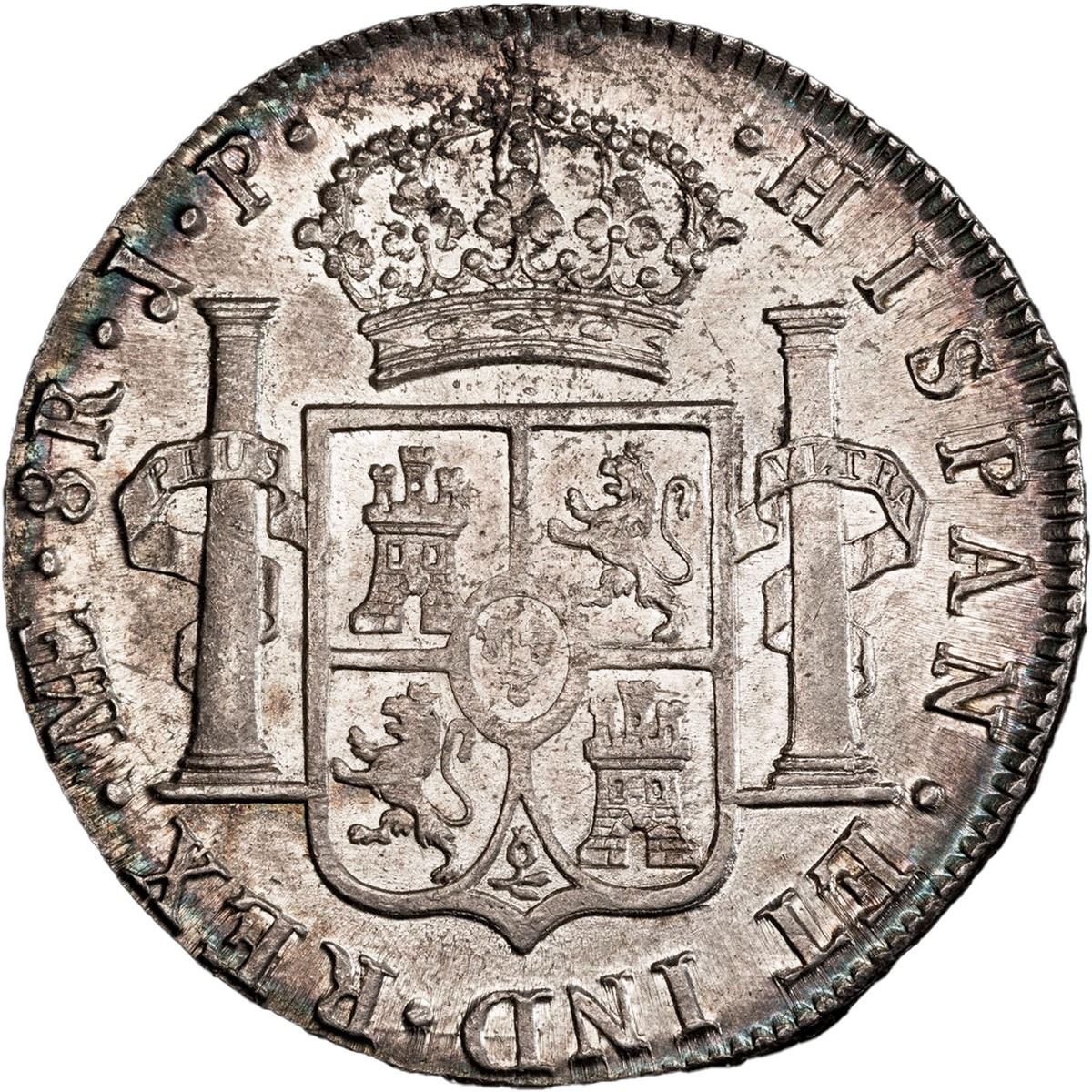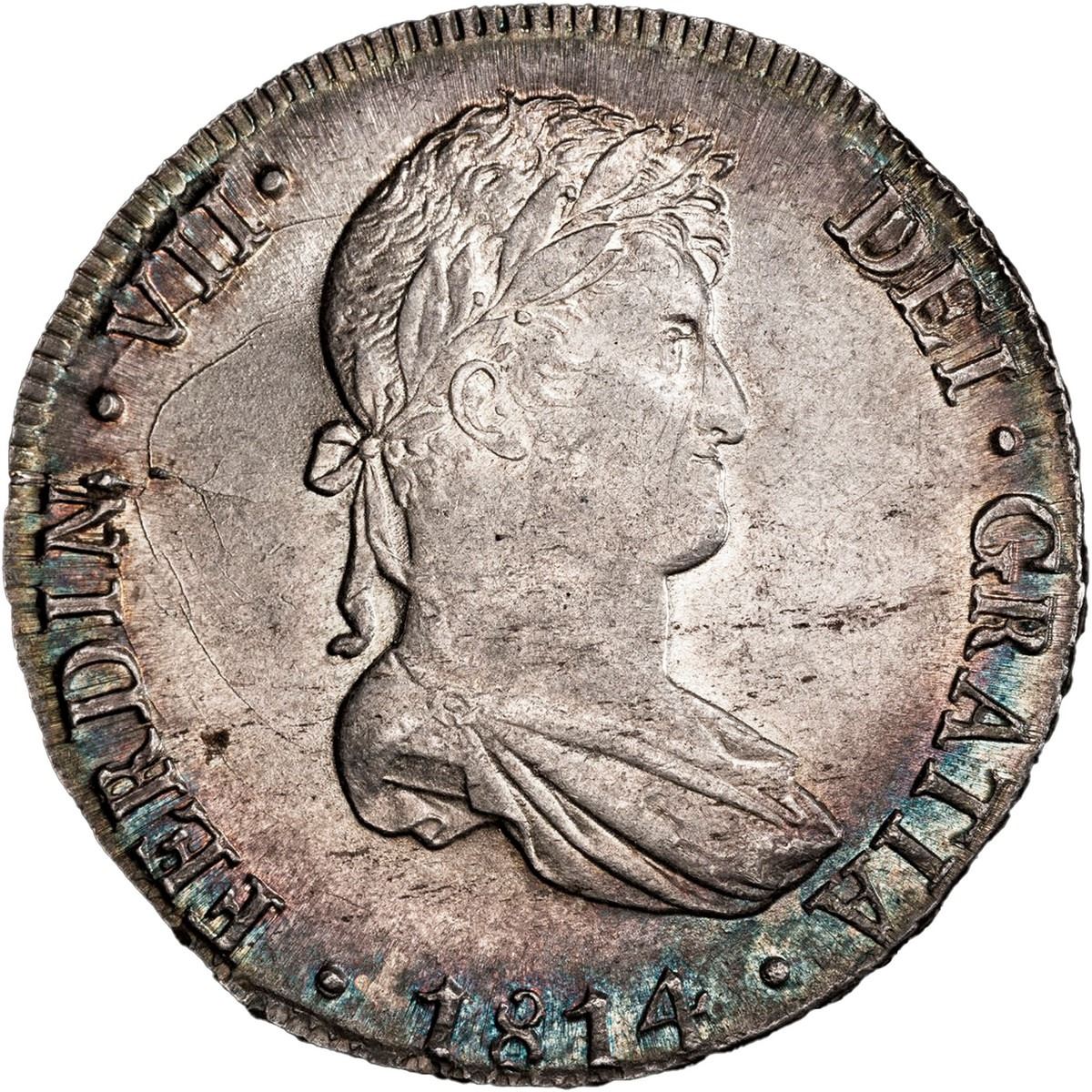 PERU, Lima, bust 8 reales, Ferdinand VII, 1814 JP, PCGS MS63, "top pop." Cal-1247; KM-117.1. Intense dark rainbow toning at rims surrounding frosty inner details with much luster, spidery die-cracks to left of bust, very appealing and currently tied with three others for finest in the PCGS census.