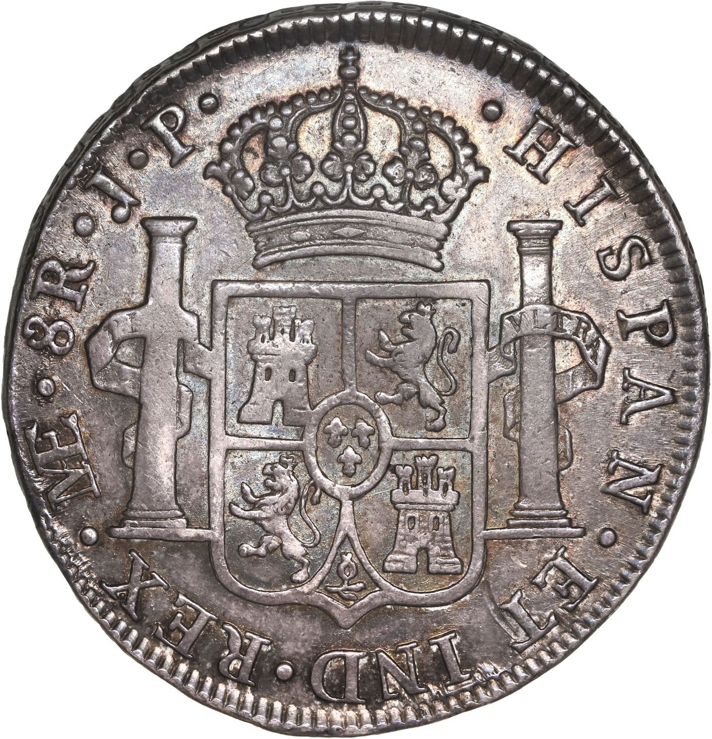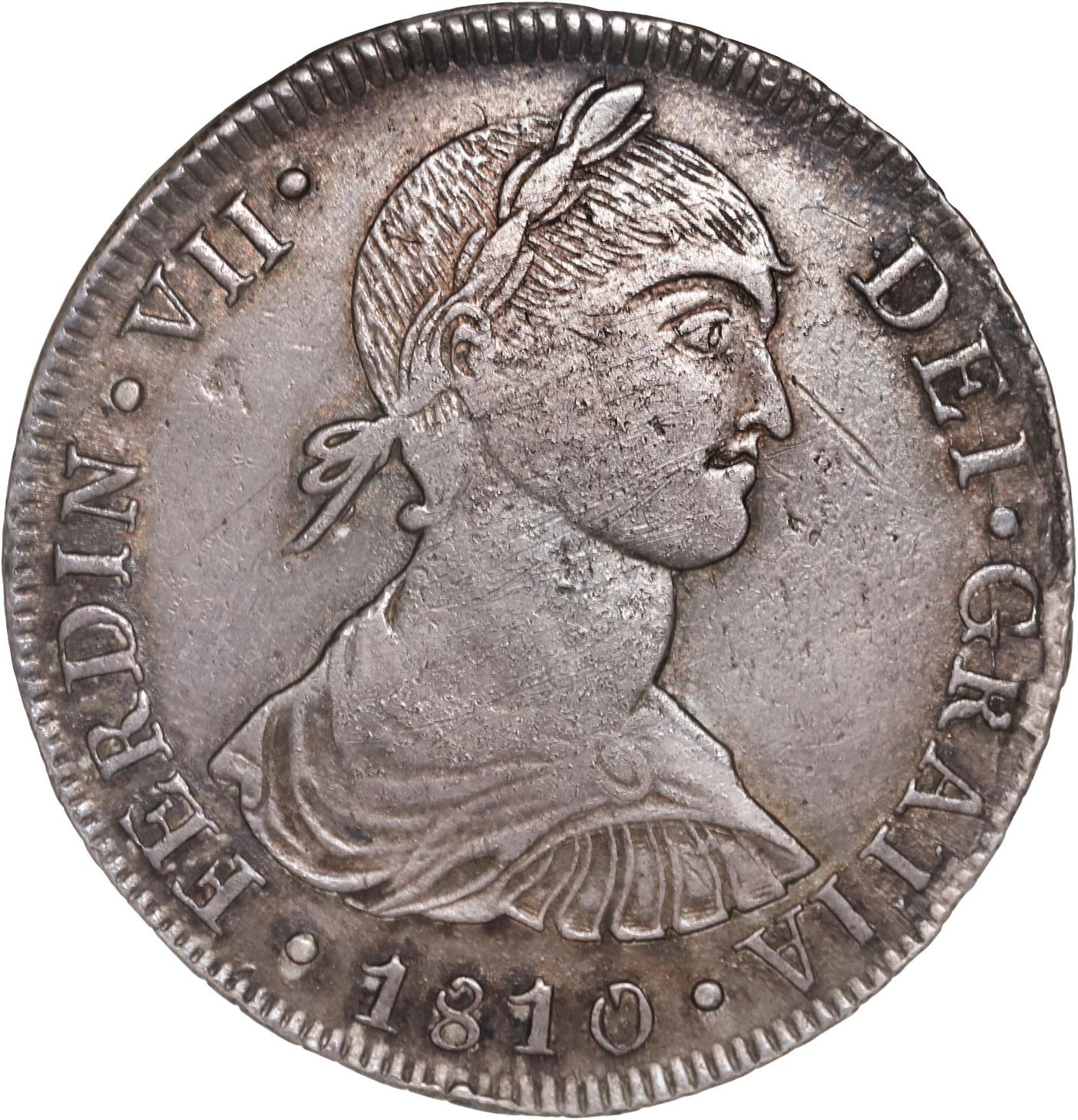 PERU, Lima, bust 8 reales, Ferdinand VII transitional ("imaginary" bust), 1810 JP. KM-106.2; Cal-1241. 26.51 grams. Very richly toned XF with underlying luster but lots of old scratches on bust, attractive overall and a scarce type. Pedigreed to the Ponterio auction of November 2006, with original lot-tag 713.