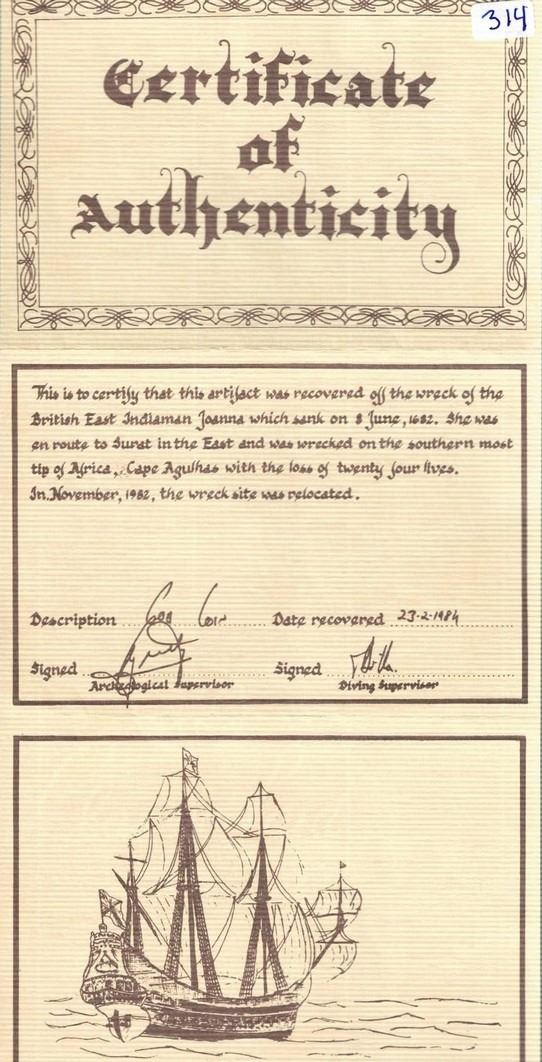 PERU, Lima, cob 1 real, 1659 V, "Star of Lima" type with date below L-star-M, rare. S-L5; KM-15; Cal-676. 0.79 gram. Thin and fragmentary from corrosion but with surprisingly clear mintmark with eight-point star between L and M above 1659 date between pillars, also with visible assayer V to left, cross side devoid of details. With original (generic) certificate from the salvors. Recovered from: Joanna, sunk in 1682 off South Africa