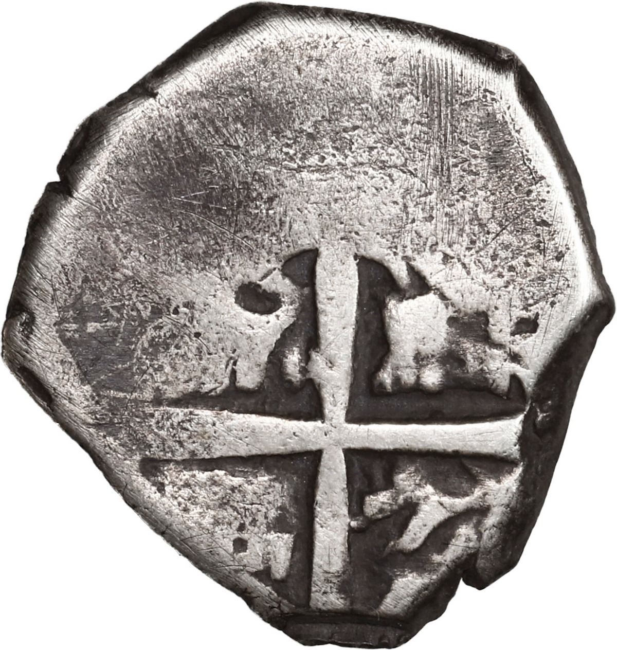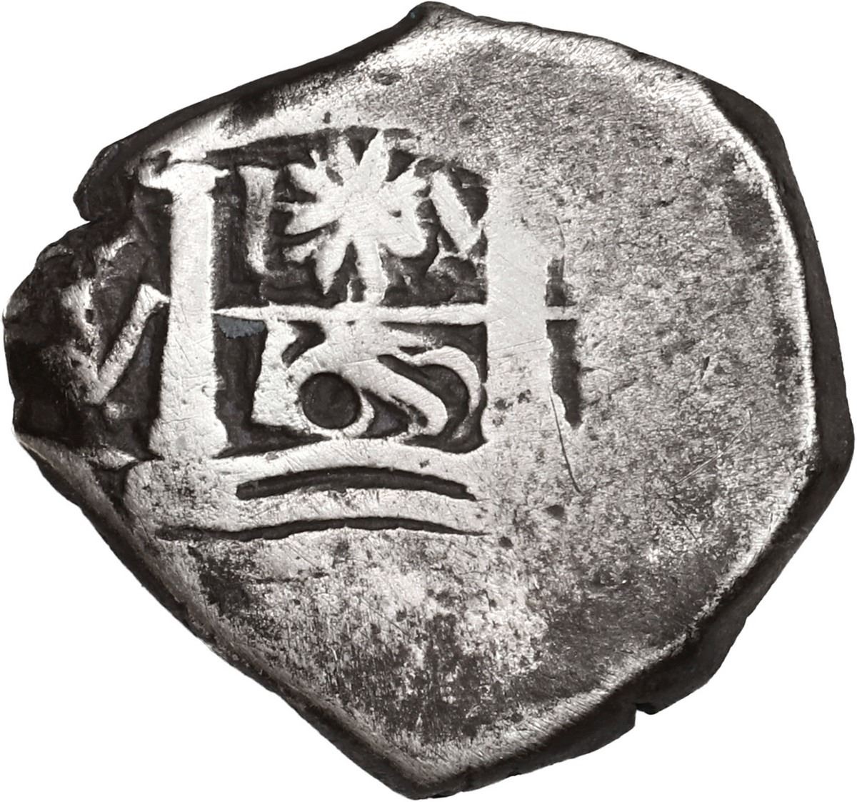 PERU, Lima, cob 1 real, 1659 V, mintmark L?M, V to left, rare, ex-Ugaz. Sedwick-II.1.1; S-L5; KM-15; Cal-676. 3.42 grams. Small flan with nearly full cross and pillars-and-waves but flat in peripheries, clear assayer and full L?M above horizontal line with date below, Fine with patchy dark toning. Pedigreed to the Jorge Ugaz Collection.