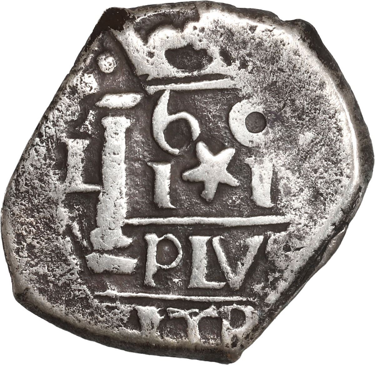 PERU, Lima, cob 1 real, 1660 (V), mintmark L to left, date 60 over I*I above PLVS / VLTRA in middle, very rare, ex-Ugaz. Sedwick-III.1.2; S-L5; KM-15; Cal-677. 2.70 grams. As with the 8 reales (lot 643), the date 1660 is far rarer than 1659 in 1R too, and this is a choice example of the second variety in our tabulation (see Sedwick Auction 35), with very bold full left pillar and central elements (date and denomination), albeit slightly off-center, the cross even more so, VF details with contrasting toning over slightly porous surfaces. Pedigreed to the Jorge Ugaz Collection.